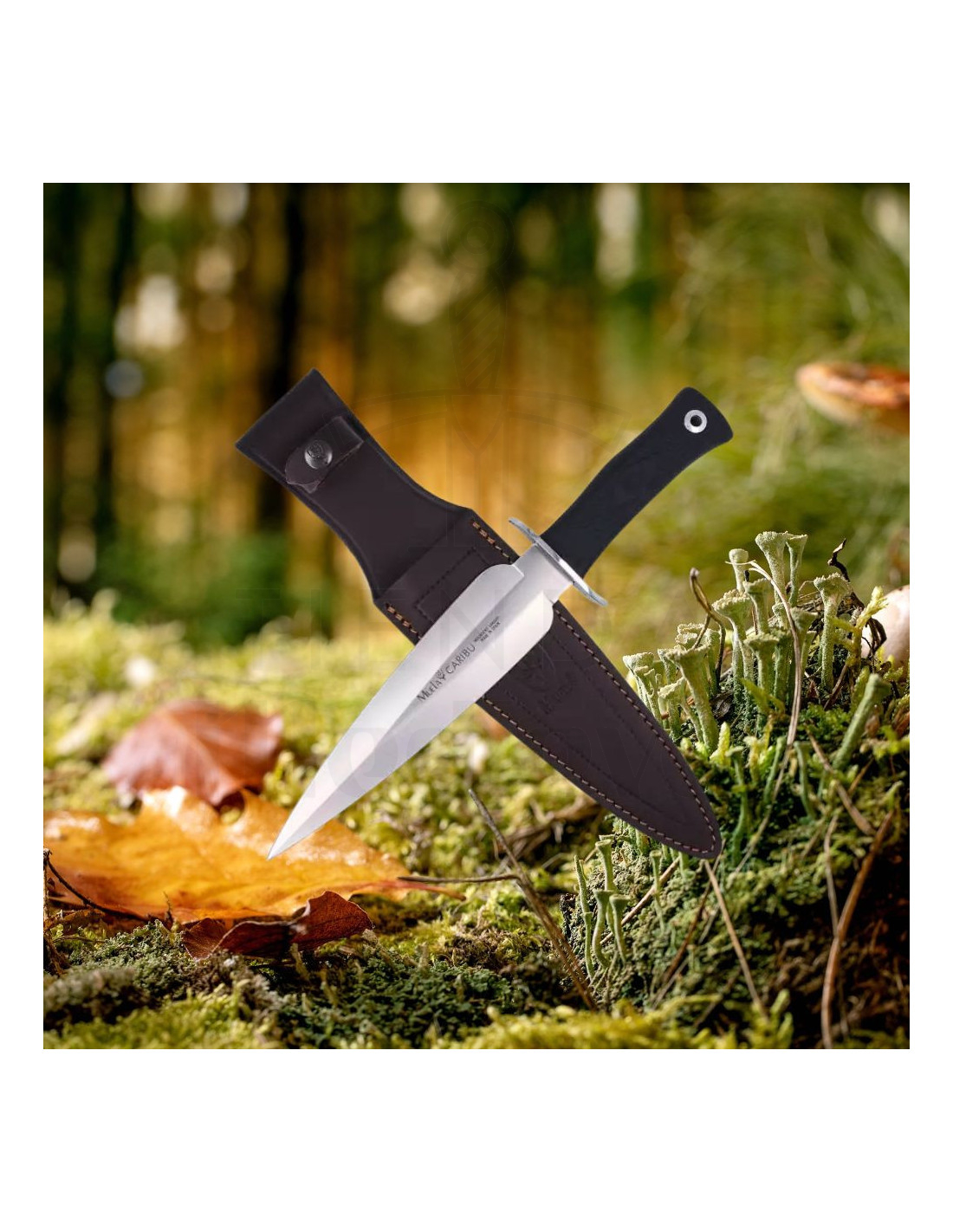 El CARIBU.G viene acompañado de una elegante funda de cuero marrón, perfecta para el transporte y protección del cuchillo. Cada pieza es fabricada en Ciudad Real, España, lo que asegura la alta calidad y cumplimiento de los estándares europeos.