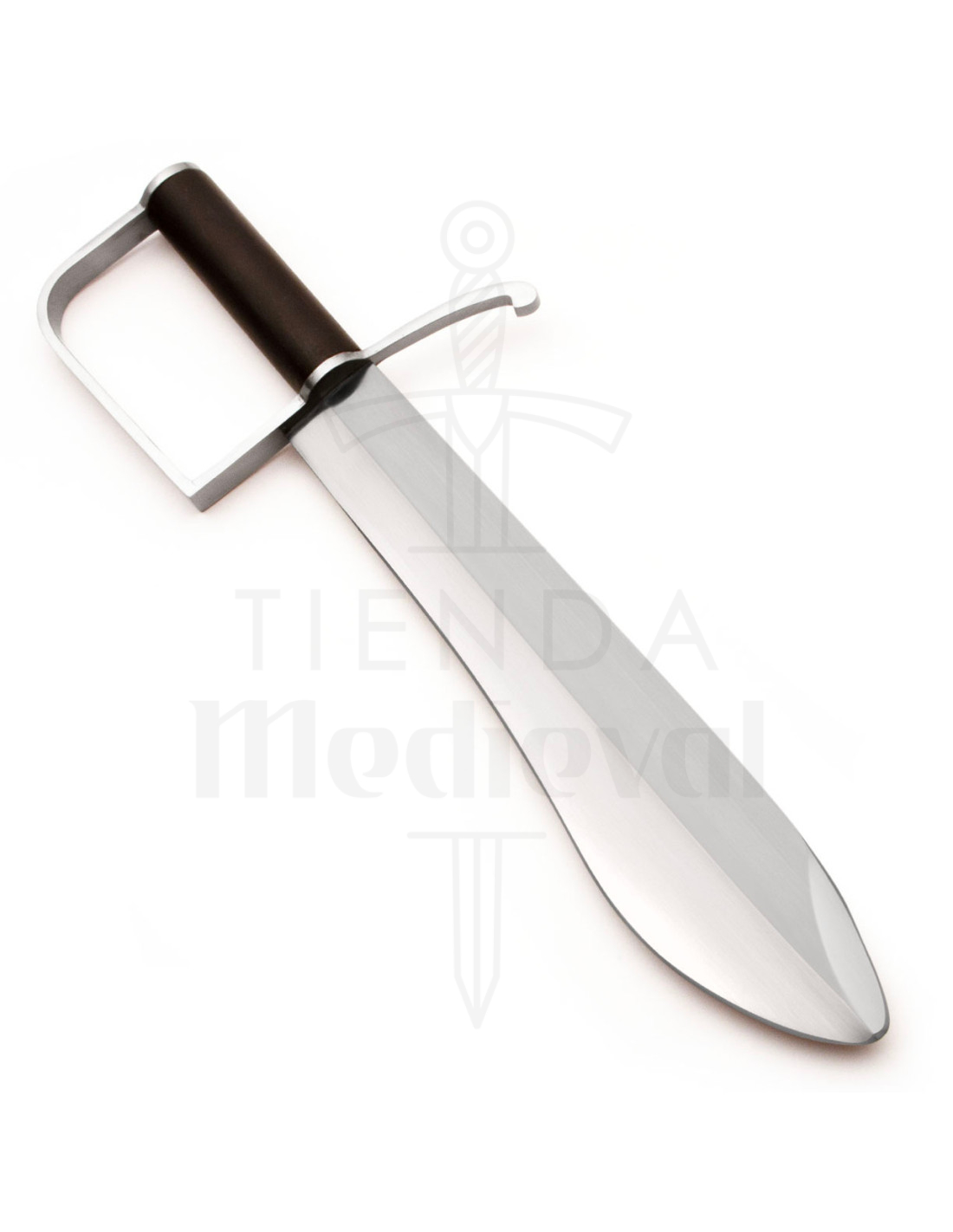 Más que una reproducción, es una pieza concebida para dar confianza en el uso y comodidad en el porte. La empuñadura cilíndrica, teñida en un marrón oscuro, facilita un agarre natural y seguro, y la guarda con protector angular resguarda los dedos en maniobras exigentes. La punta ligeramente redondeada y los biseles inferiores ahuecados permiten cortes contundentes y controlados, transformando la hoja en una herramienta tipo machete con gran potencia.