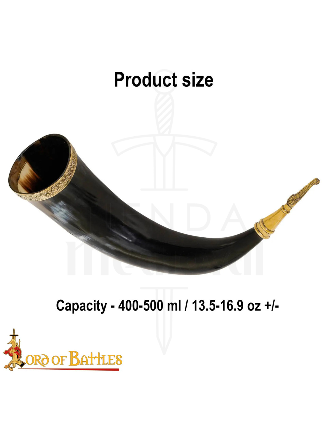 La funcionalidad se fusiona con el lujo gracias a sus acabados en latón. El borde de latón sólido no solo refuerza la boca del cuerno, garantizando una durabilidad excepcional, sino que añade un toque dorado y ornamentado. La punta de latón completa el diseño, haciendo que el cuerno sea tan resistente para el uso frecuente como majestuoso para ser exhibido. Con una capacidad generosa de 400 a 500 ml, podrás disfrutar de tu hidromiel o cerveza como un verdadero Northman.