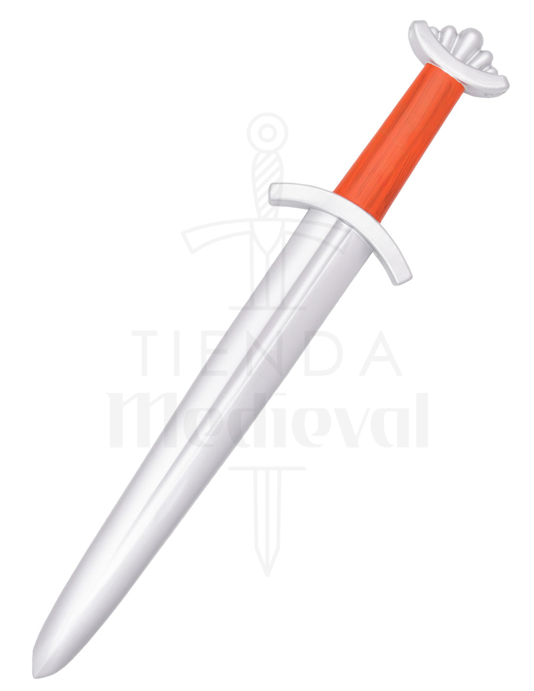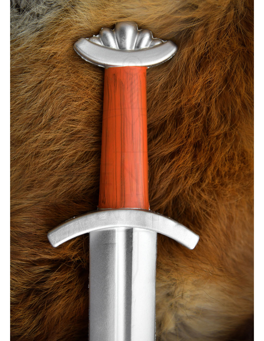 Su acabado blanco-plateado recrea el brillo del acero antiguo, mientras que la empuñadura naranja con vetas simuladas aporta calidez visual y un agarre que parece madera real, sin renunciar a la durabilidad. El guardamanos y la punta de la empuñadura en tonos claros refuerzan la apariencia histórica, completada por un pomo de cinco lóbulos inspirado en piezas vikingas, que suma personalidad sin complicaciones.