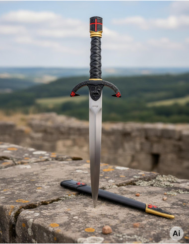 La vaina negra con acabados en dorado y cruces rojas complementa el diseño, haciendo de esta daga una auténtica joya que combina simbología histórica con arte decorativo. Perfecta para coleccionistas, fanáticos de la historia o quienes desean añadir un toque medieval a su decoración, esta daga de estilo templario es una pieza exclusiva para destacar en cualquier espacio.