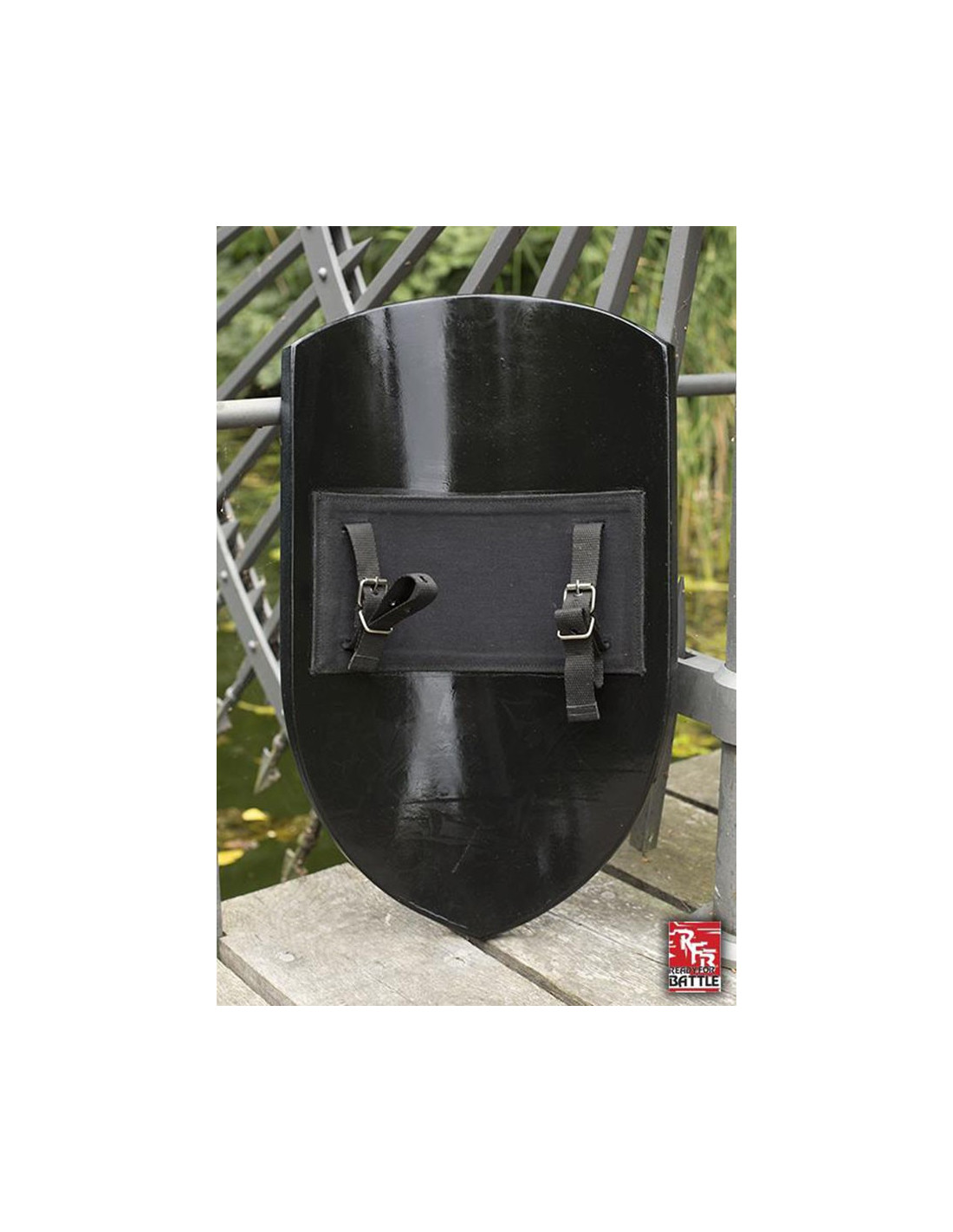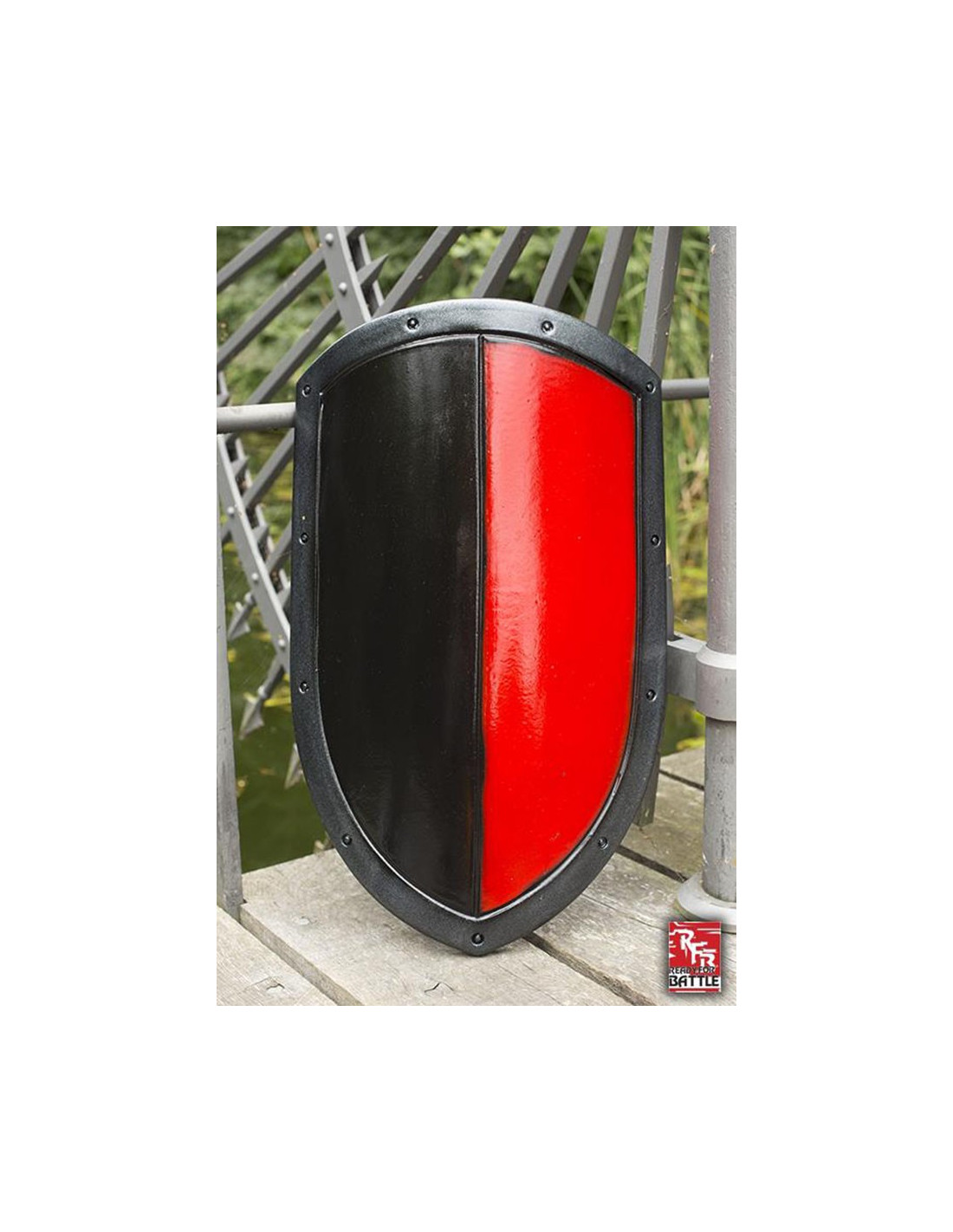 El escudo Kite bicolor destaca por su acabado en rojo y negro, que le confiere un aspecto llamativo y poderoso. Además, cuenta con un borde de hierro que le añade un toque de realismo. Su diseño simple pero atemporal lo convierte en una opción versátil que se adaptará a cualquier juego de LARP que te encuentres.