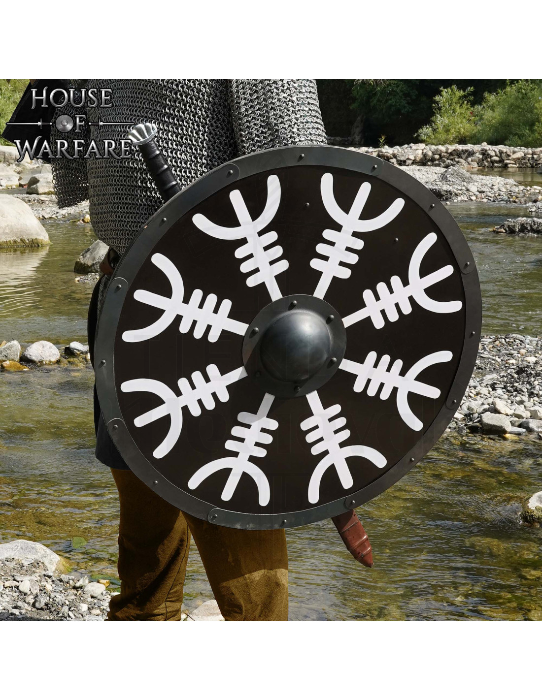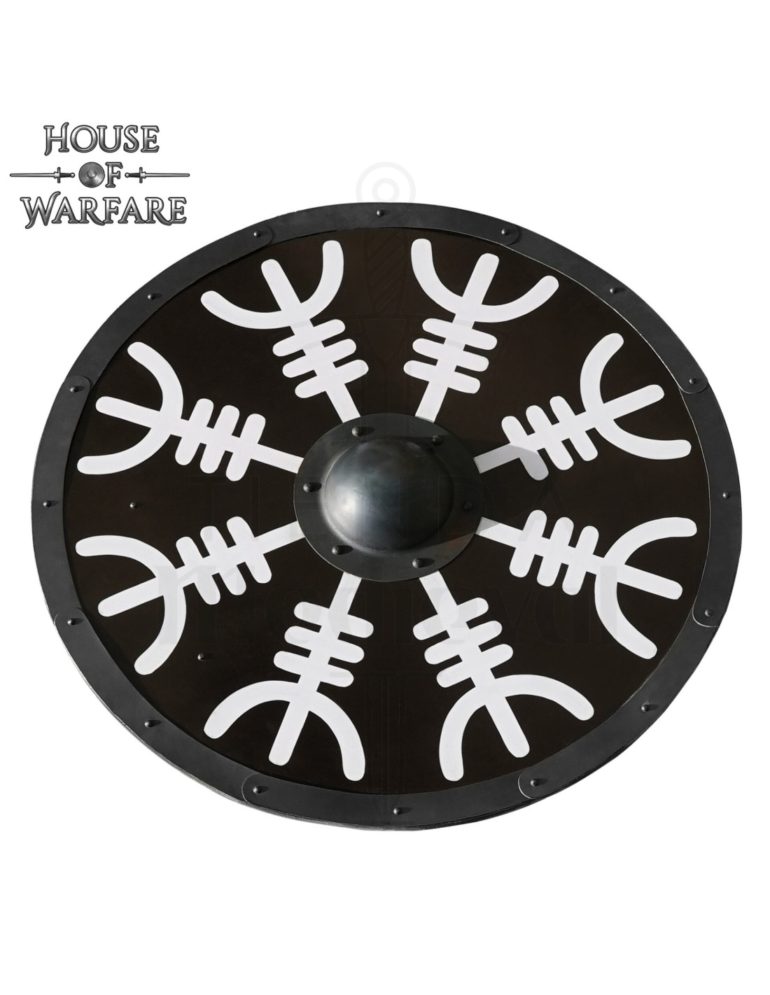 El acabado en negro y blanco con el símbolo del Aegishjalmur domina la superficie, mostrando ocho emblemas dispuestos en perfecta simetría alrededor de un golpeador metálico central, lo que le da un aspecto auténtico y visualmente impactante para fotografías, filmaciones o exhibiciones.