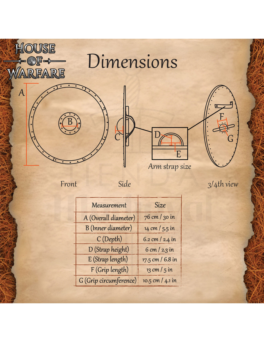 El golpeador cúpula y el borde remachado actúan como protección efectiva de la mano y del perímetro, prolongando la vida útil del artículo incluso en uso repetido, mientras que los remaches visibles refuerzan ese aspecto guerrero que tanto atrae a coleccionistas y aficionados.