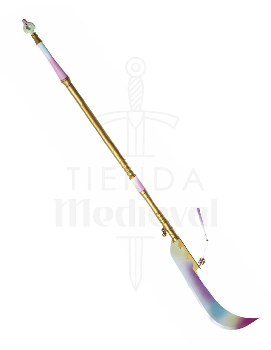 El diseño juega con degradados y detalles que cuentan una historia: del mango estriado en tonos dorados que aporta agarre y elegancia, a la parte inferior con matices rosa y azul que aportan personalidad. La hoja curva muestra un acabado en blancos, azules y morados con reflejos brillantes, y el adorno dorado entre mango y hoja, acompañado de un pequeño tassel lila, añade un toque de lujo artesanal.