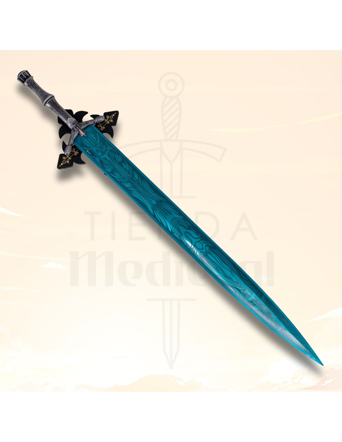 Su hoja de 95,5 cm presenta un patrón que recuerda la madera veteada, aportando un carácter distintivo y artesanal, mientras que el grosor de 4,7 mm asegura una presencia imponente sin ser demasiado pesada. Con un peso total de apenas 2042 gramos, se maneja con comodidad, permitiéndote exhibirla sin complicaciones. Incluye un soporte decorativo que realza aún más su estética, ideal para poner en la pared o en una vitrina.