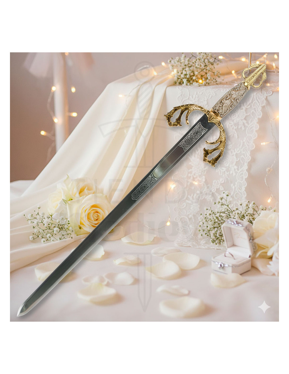 Incluye el texto estándar "RDO. DE NUESTRO ENLACE", que le dará un toque personalizado y único a esta espada tan especial.