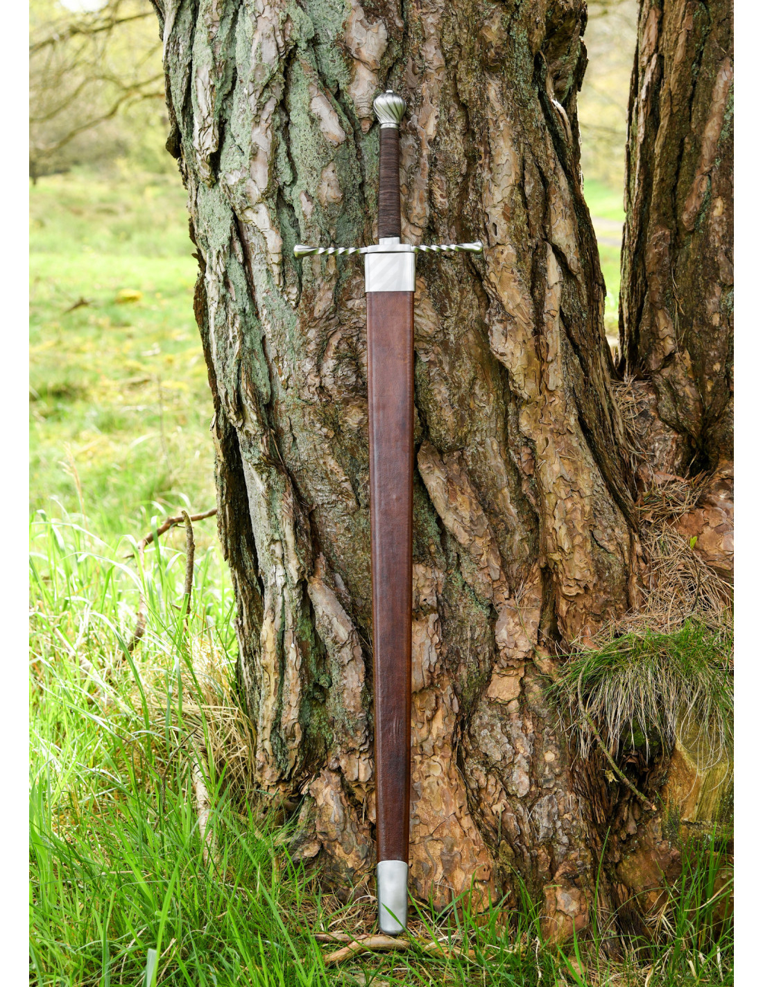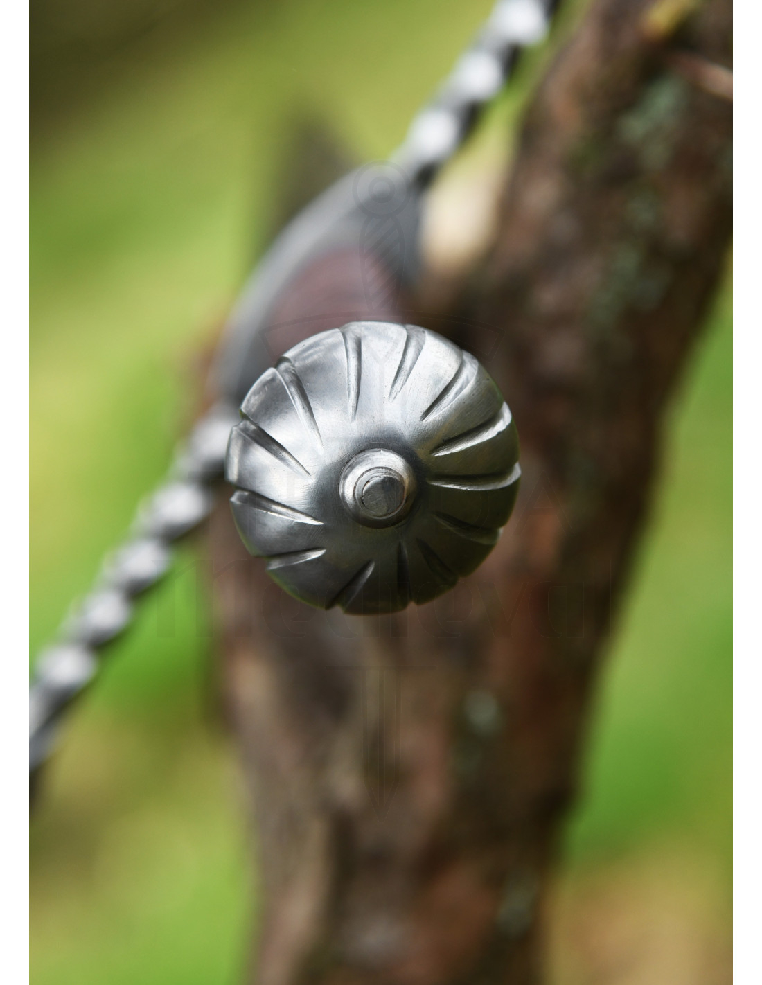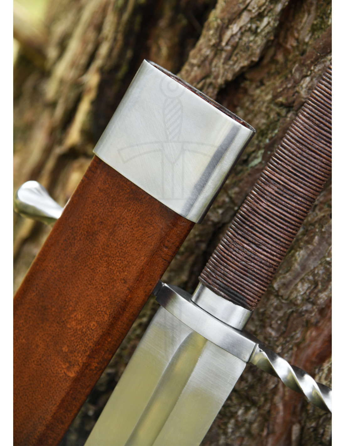 Una de las características más destacadas de esta espada es su empuñadura de madera revestida en cuero. Esto no solo garantiza un agarre firme y cómodo durante el combate, sino que también le otorga un aspecto auténtico y elegante.