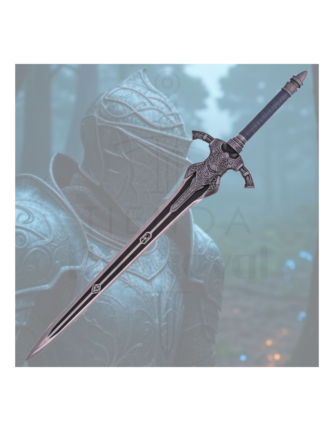 Con un diseño impresionante que combina el contraste del negro y el plateado, cada detalle en relieve de la hoja y el pomo cuenta una historia visual que fascina a primera vista. La empuñadura, recubierta con polipiel negra texturizada, ofrece un agarre que invita a ser admirado, mientras que el conjunto viene acompañado de un soporte que facilita su exhibición, dándole el protagonismo que merece.