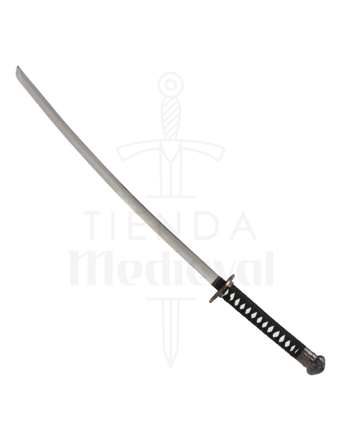 Su hoja, brillante y cuidadosamente pulida, refleja la luz como si estuvieras contemplando un arma forjada por antiguos maestros. La curva perfecta de la hoja no solo aporta belleza, sino que facilita una manipulación más ágil y fluida, ideal para quienes buscan exhibirla y sentir su equilibrio al sostenerla.