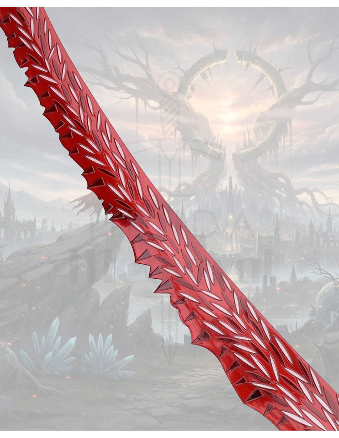 La hoja curvada, pintada en rojo con motivos puntiagudos y líneas que dibujan movimiento, crea un efecto dramático que atrae todas las miradas. Ese borde dentado y sus cortes irregulares no solo aportan carácter visual, sino que transmiten una sensación de potencia y detalle, perfecta para quien busca una pieza decorativa con presencia y personalidad.