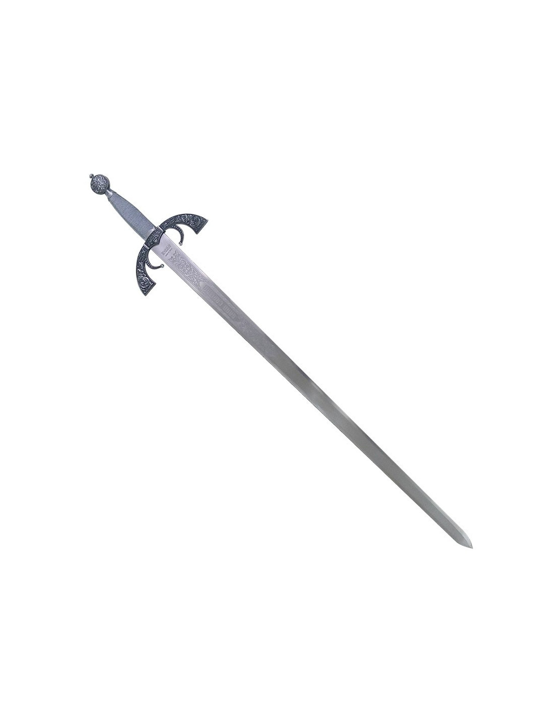 La hoja de acero envejecido de esta espada garantiza su resistencia y durabilidad, manteniendo la esencia histórica. Su empuñadura rústica grabada no solo complementa su estética, sino que añade un toque de distinción y sofisticación que resalta en cualquier exposición.