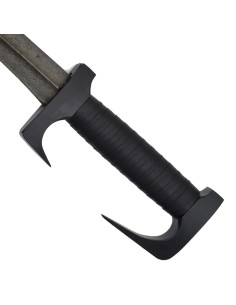 La hoja curva, de doble filo con una línea central marcada, transmite ese aspecto clásico y contundente, mientras que su forma alargada y puntada afinada realza la silueta y facilita un equilibrio natural al sostenerla. El guardamanos metálico con ganchos curvados protege la empuñadura y añade un aire de autoridad, y el pomo metálico remata el conjunto con contundencia. La empuñadura cubierta en cuero sintético, con ranuras estriadas, ofrece un agarre seguro y cómodo, ideal para mostrarla con confianza en mano.