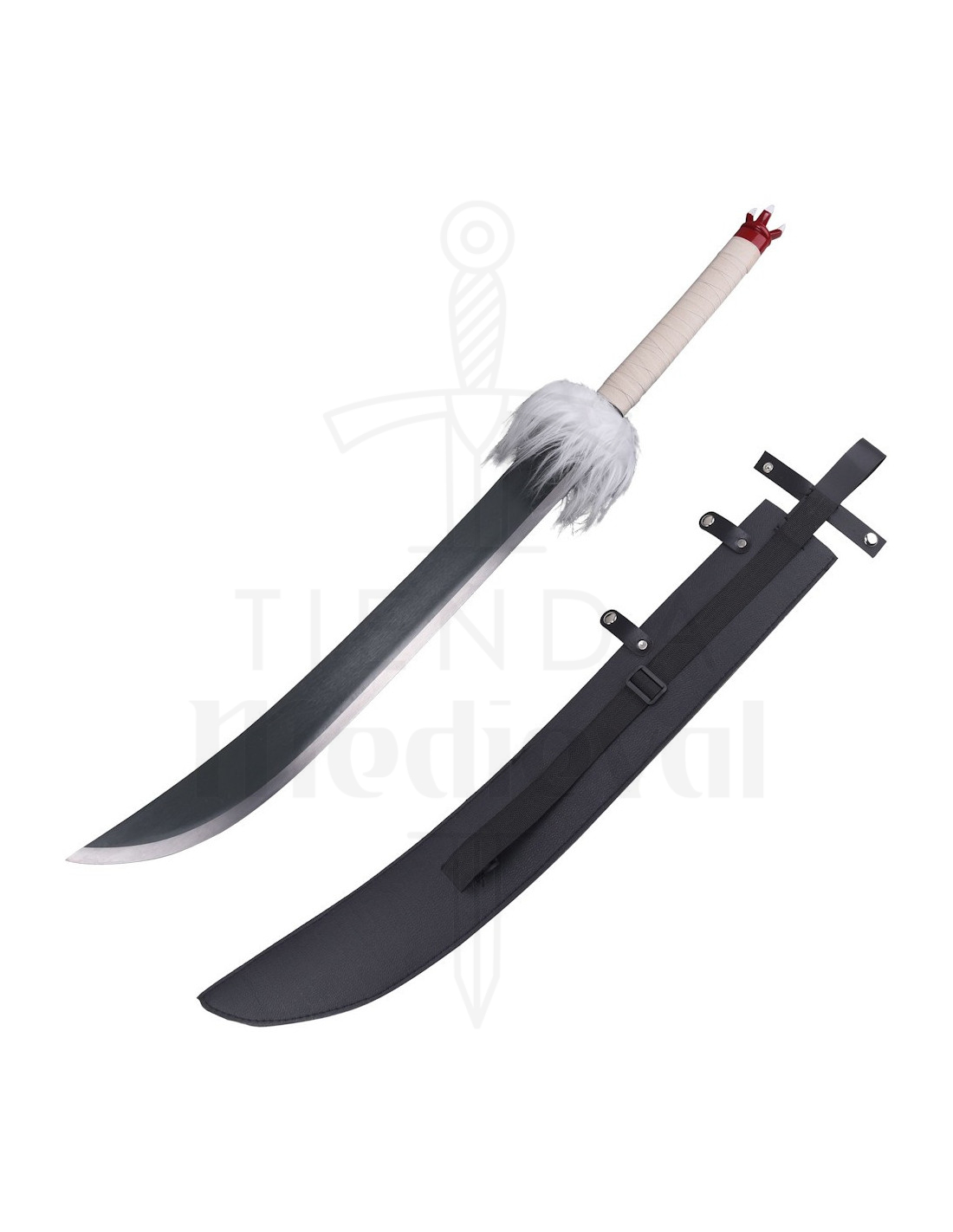 Con una hoja de acero de 650 mm, su diseño largo y curvado destaca por un acabado metálico en tonos oscuros, que aporta un aspecto robusto y auténtico. La empuñadura de madera, envuelta en textil, no solo ofrece un agarre cómodo y seguro, sino que también remata con un elegante adorno de pelaje blanco que evoca la estética mítica del personaje. La funda de cuero sintético negro, con correas resistentes, facilita el transporte y la protección de esta pieza que puede lucirse en cosplay o decorar tu espacio con estilo.