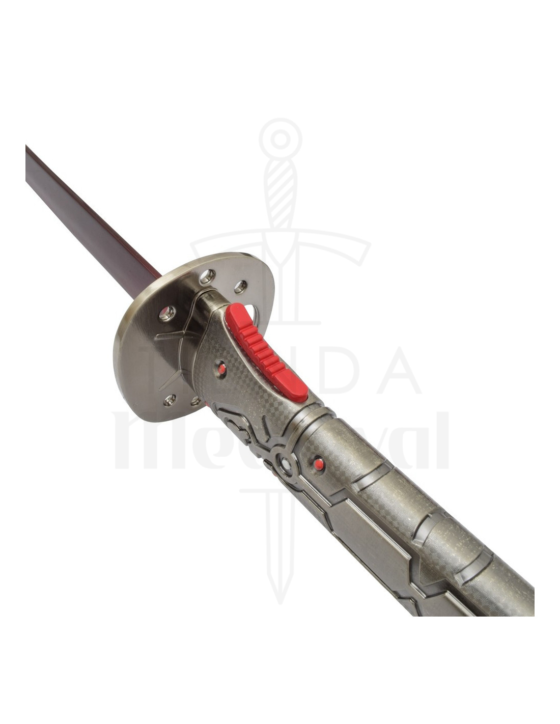 El mango metálico, cuidadosamente diseñado, ofrece un equilibrio excelente entre estética y funcionalidad, aportando una sensación de solidez al empuñarla. La funda está hecha de madera con detalles en plástico que complementan perfectamente el diseño general de la katana, brindándole un toque visualmente atractivo sin comprometer la durabilidad.