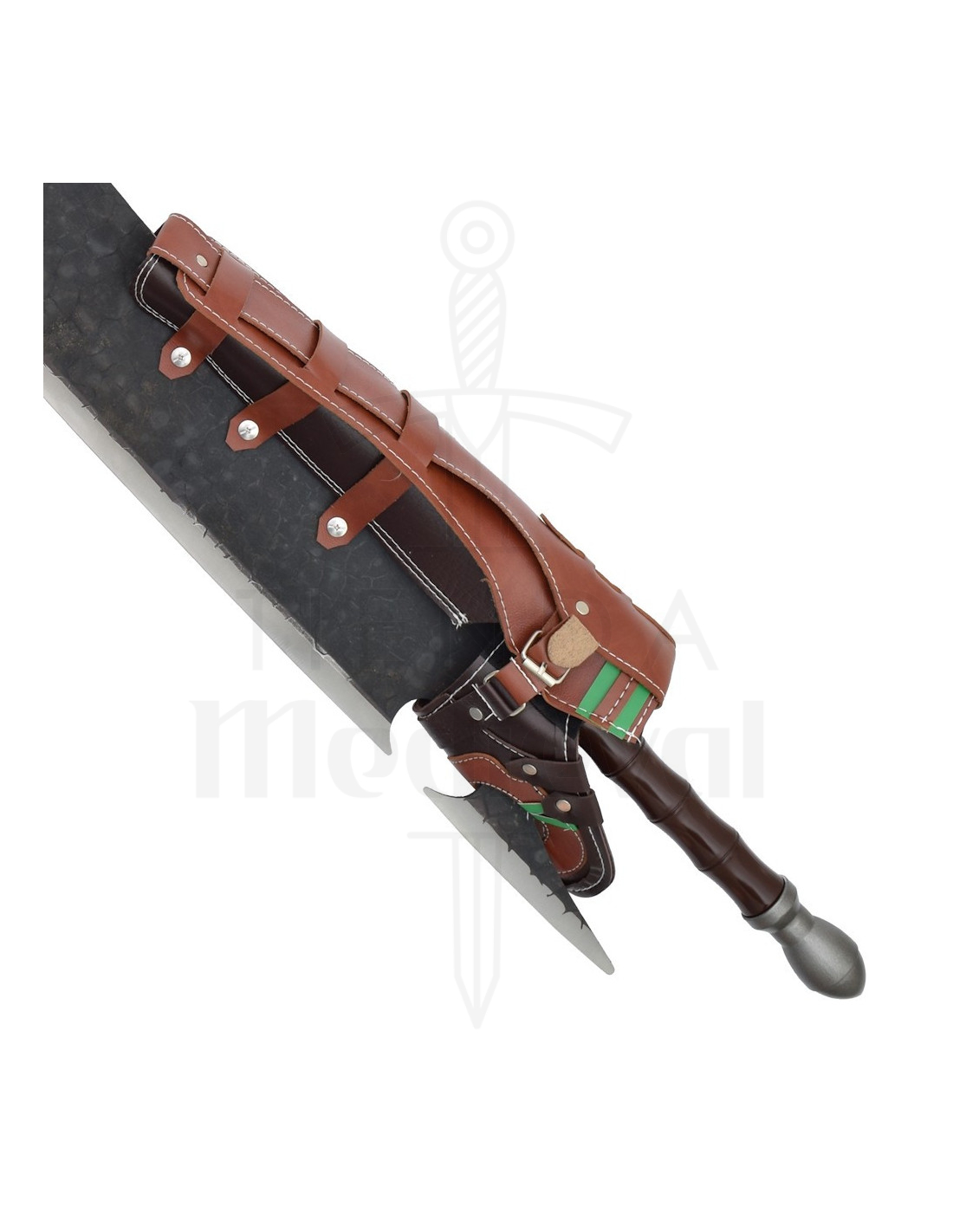 Con un diseño que respeta la estética del juego, esta réplica ofrece una presencia imponente sin poner en riesgo la seguridad, gracias a su hoja romo diseñada exclusivamente con fines ornamentales. Esa apariencia metálica texturizada en negro y la abertura decorativa junto al mango aportan autenticidad visual, mientras que las partes en cuerda y cuero sintético suman carácter y realismo al conjunto.