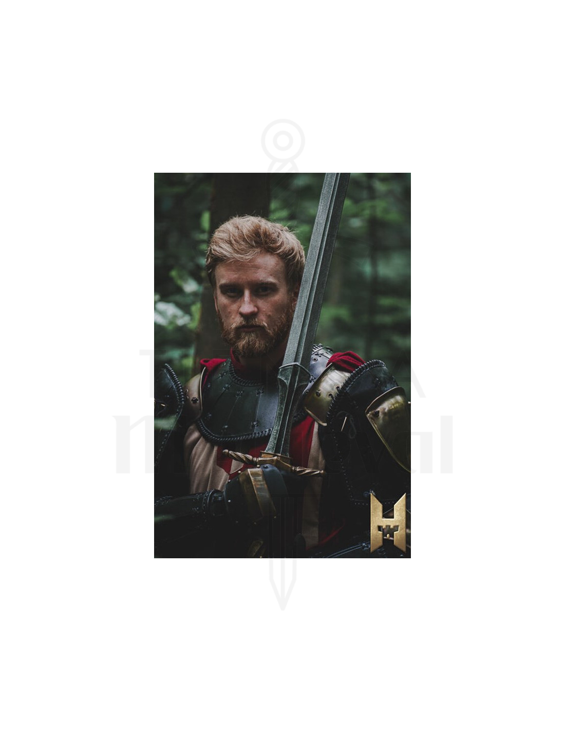 El recubrimiento de cuero en la empuñadura aporta comodidad y un firme agarre, mientras que su forma ovalada facilita movimientos precisos en combate. Con detalles decorativos que evocan una herencia de guerreros leales y convencionales, esta espada es perfecta para quien busca un equilibrio entre estética y funcionalidad.