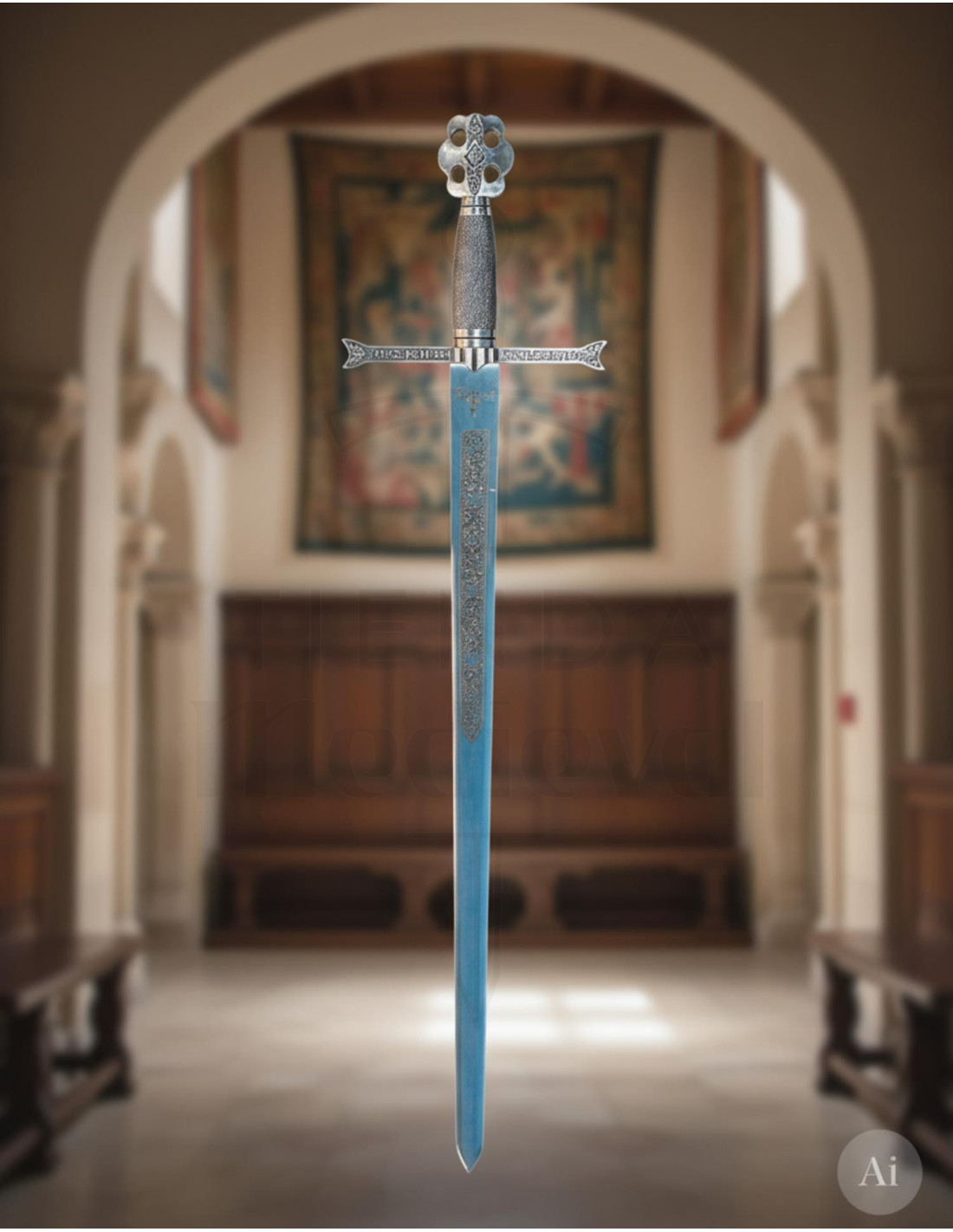 Descubre la majestuosidad de la Espada de los Reyes Católicos, una pieza única que te transportará a la época medieval. Su hoja en acero inoxidable garantiza una durabilidad excepcional, mientras que su empuñadura plateada grabada le otorga un aspecto elegante y distintivo.