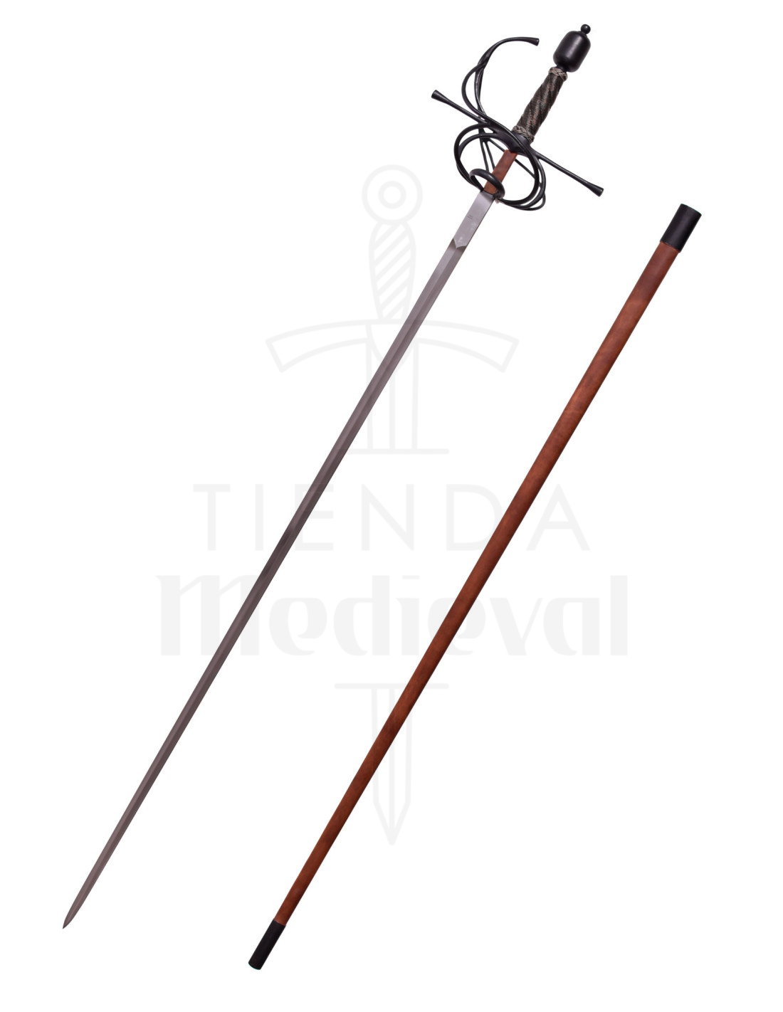 En la vista, la espada revela líneas rectas y una punta afilada que sugieren precisión en la estocada, acompañadas por una guarda enrejada que protege la mano y realza el conjunto con elegancia. El pomo redondeado en tono oscuro y el mango texturizado mantienen la sensación de control, y la vaina rígida en marrón, con refuerzos negros, facilita el transporte y permite exhibirla con orgullo en cualquier espacio.