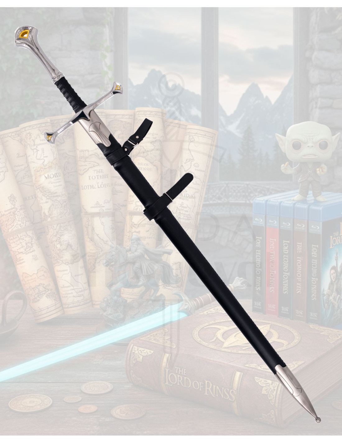 Si te atrae el universo de El Señor de los Anillos, esta réplica evoca la fuerza simbólica de una espada forjada para líderes y héroes, un objeto cargado de presencia que conecta con la mitología y la estética de la saga.