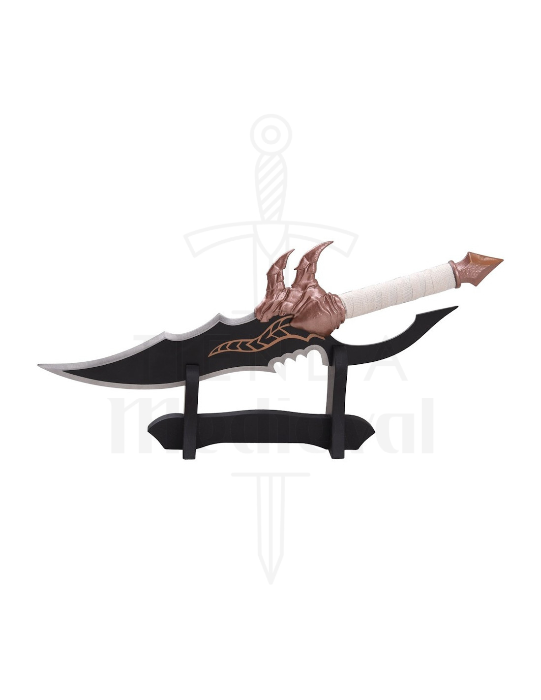 El diseño irregular de la hoja, con bordes ondulados y muescas tipo sierra, ofrece un aspecto agresivo que parece salido de una escena épica. Ese acabado negro con toques cobre le da profundidad visual, haciendo que cada ángulo revele detalles nuevos, perfecto para quienes buscan una pieza de colección que destaque sin esfuerzo.