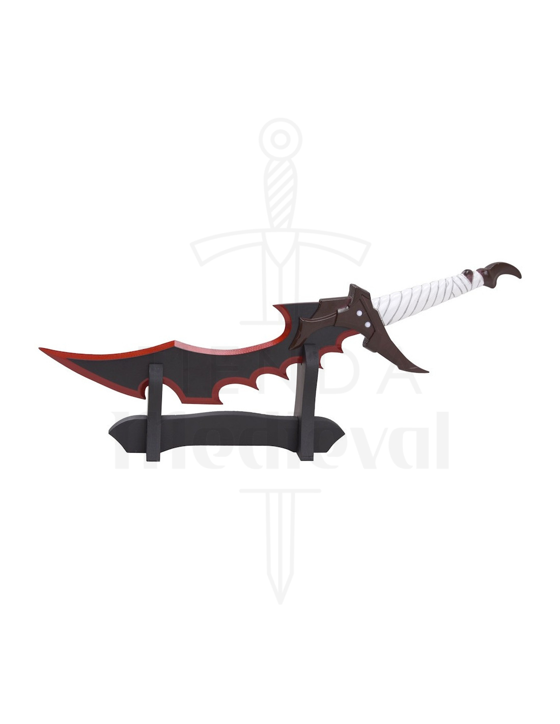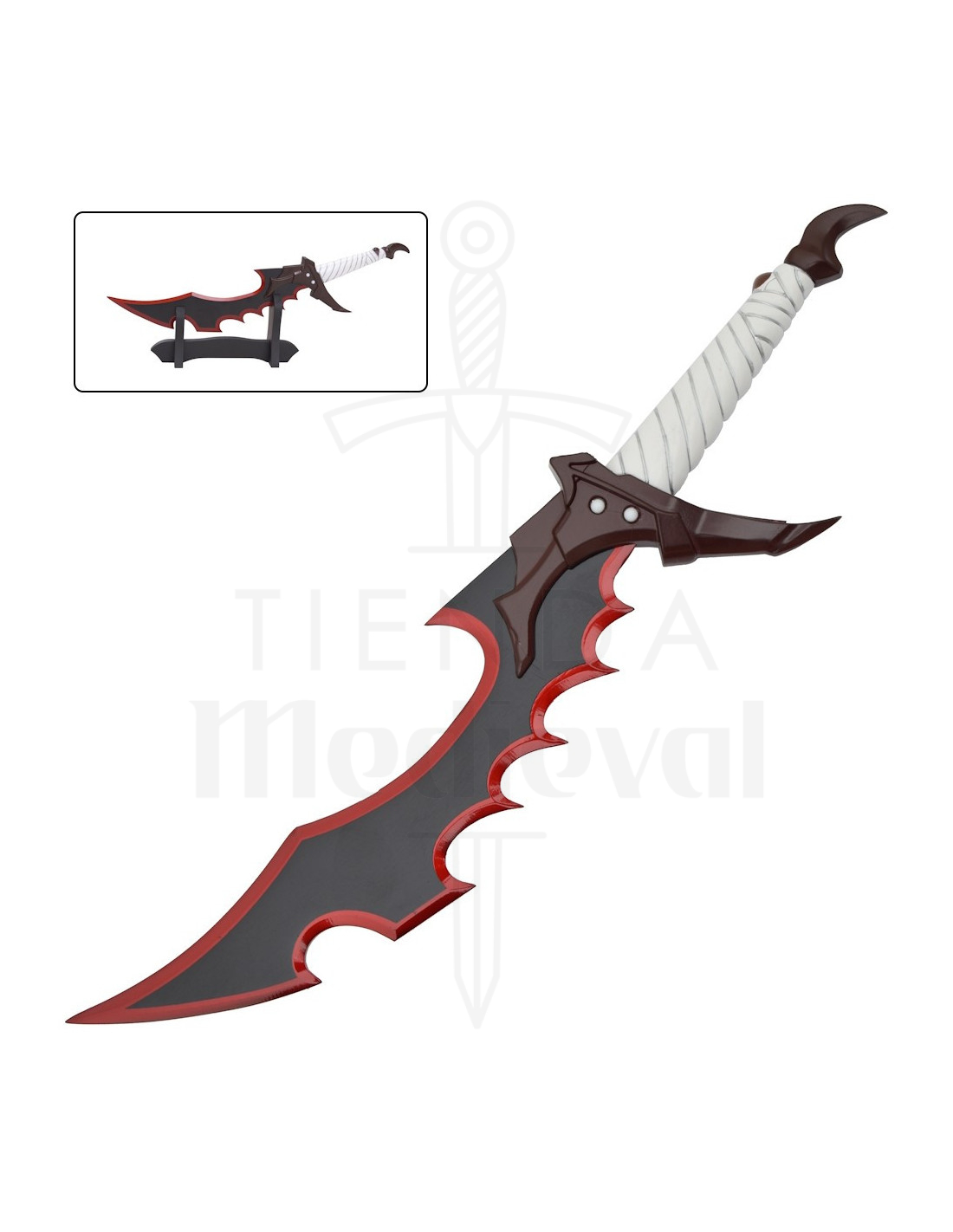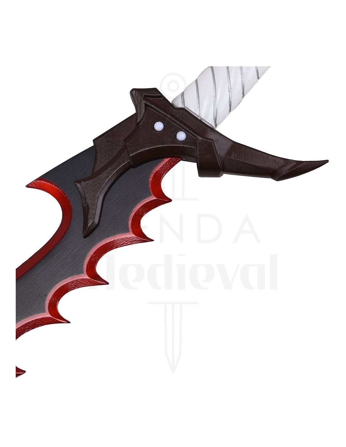 El diseño angular de la guarda y el pomo en tono marrón oscuro aportan una silueta agresiva y elegante, que refuerza la sensación de pieza de colección. El contraste entre la hoja oscura con ribete rojo y la empuñadura blanca crea un impacto visual inmediato, perfecto para quienes desean una decoración con personalidad o un complemento fotográfico llamativo para su set de colección.