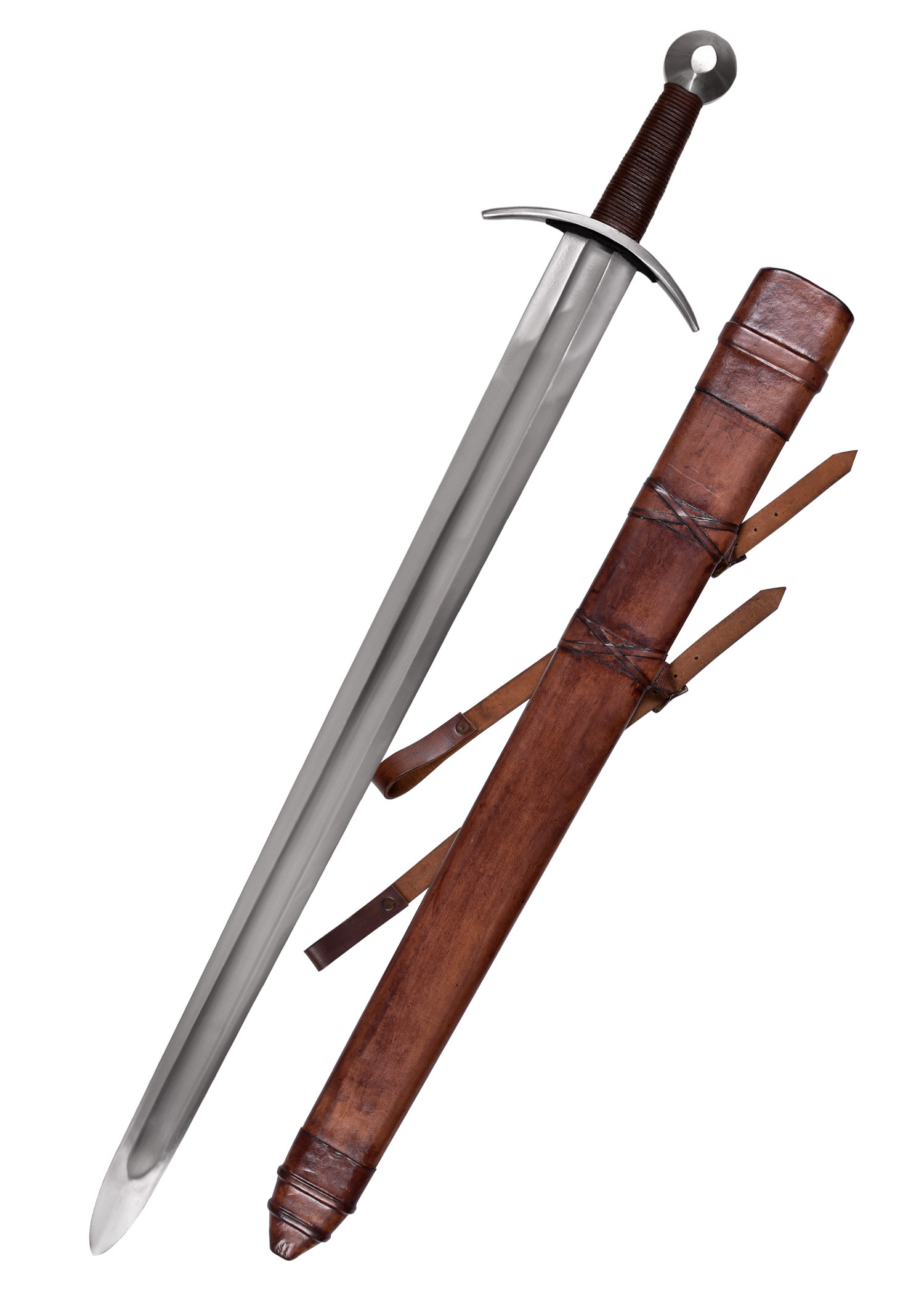La hoja de acero templado tiene un surco distinto que ofrece una gran flexibilidad y un menor peso. Los bordes de la hoja son roma y la punta está redondeada para mayor seguridad. La guarda doblada y el pomo están hechos de acero. Además, esta hermosa espada viene con una vaina de madera envuelta en cuero con una correa de cuero para sujetarla al cinturón. ¡Hazte con ella para exhibirla en tu hogar o para tus próximos eventos medievales!