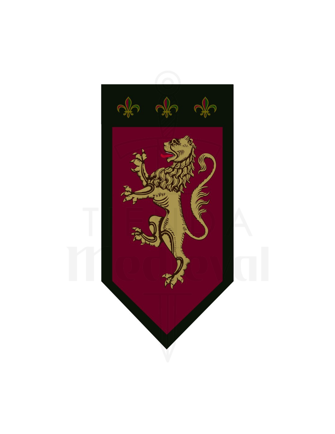¿Buscas darle un toque impresionante a tus eventos medievales o fiestas temáticas? Este banderín con un diseño heráldico es la elección perfecta para destacar y captar la atención de todos. Con un fondo de color burdeos, símbolo de nobleza y tradición, y un magnífico león dorado en postura erguida, transmite poder, valentía y autoridad, ideales para ambientar mercados antiguos o celebraciones temáticas. Las detalladas características del león, con pelaje bien definido y una lengua roja vibrante, aportan un toque de realismo y majestuosidad, mientras que las elegantes flores de lis en amarillo y verde en la parte superior añaden un toque clásico y distinguido.