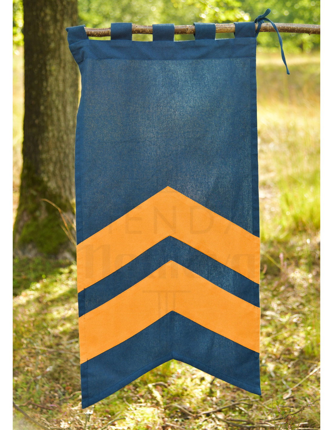 Con base en un azul oscuro profundo y dos franjas en 'V' en tono cálido, este estandarte ofrece una presencia visual poderosa, capaz de transformar cualquier espacio en foco de atención. La forma punteada en la parte inferior sigue el contorno de las franjas, aportando un acabado elegante que cae con gracia, mientras que el tejido 100% algodón aporta textura natural y movimiento, perfecto para exhibir en interiores temáticos o en eventos al aire libre con carácter.