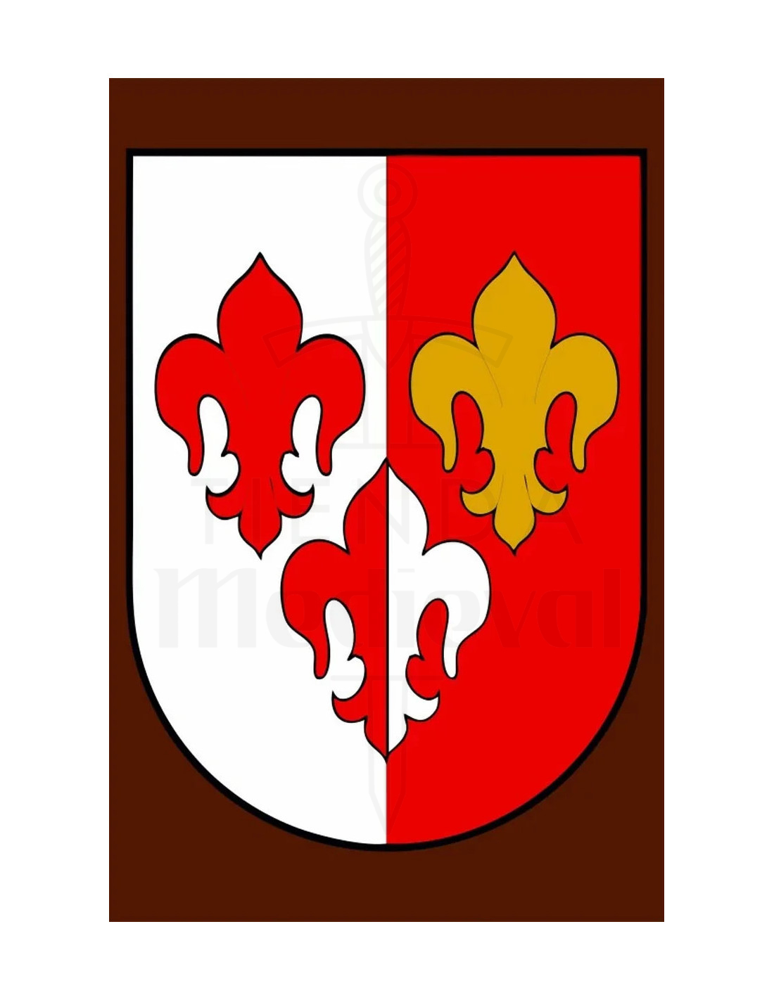 Este Estandarte medieval 3 flores de lys, 75 x 50 cm. destaca por su diseño dividido en dos mitades, una blanca y otra roja, que crea contraste y presencia. Sobre la mitad blanca aparece una flor de lis roja, mientras que la mitad roja acoge dos flores de lis, una dorada en la parte superior y otra blanca en la inferior, todo enmarcado por un contorno negro que realza cada detalle sobre un fondo marrón, aportando profundidad y carácter a cualquier pared.