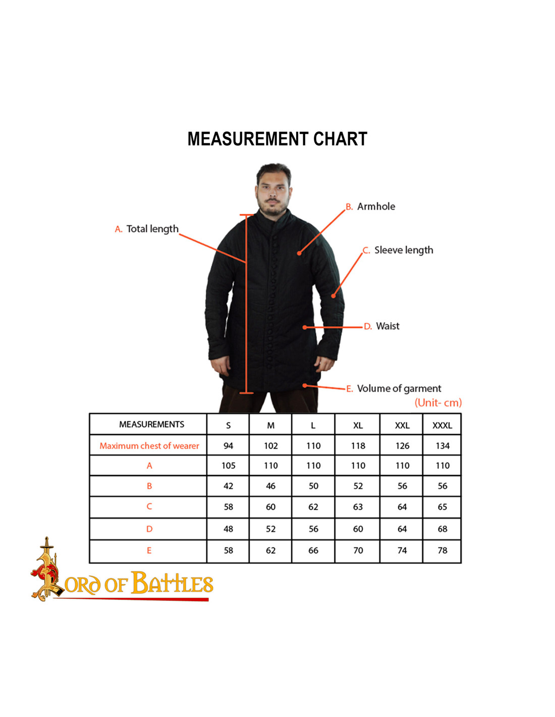 Este gambesón no es un simple adorno: es una prenda robusta, elaborada con lona verdadera y relleno auténtico, diferencia que marca la calidad y la historia detrás de cada pieza. Gracias a sus mangas abotonadas y su ajuste completamente ajustable, garantiza comodidad para usarlo solo o bajo una armadura de placas o malla. Disponible en seis tallas distintas, con una guía detallada para que encuentres la que mejor se adapta a ti, asegura un calce perfecto y seguridad sin sacrificar movilidad.