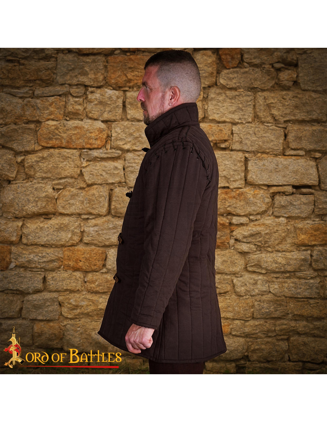 Visualmente, el tono marrón oscuro y el patchwork acolchado vertical crean una presencia rústica y creíble, ideal para personajes de ambientación medieval o para quien busca un aspecto sólido en recreación histórica.