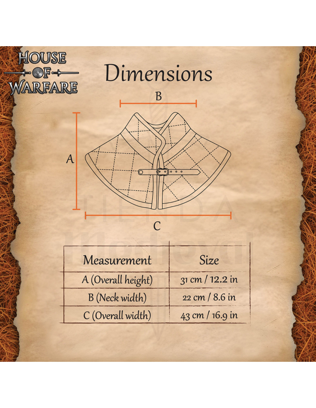 El alto cuello y los paneles acolchados sobre los hombros protegen garganta, clavícula y la parte superior del pecho, ofreciendo una defensa extra cuando se combinan con otras piezas de armadura o se usan por separado. El cierre con correa ajustable y hebilla metálica garantiza un ajuste firme y seguro, listo para exigencias de HEMA, LARP, SCA o combate escénico.