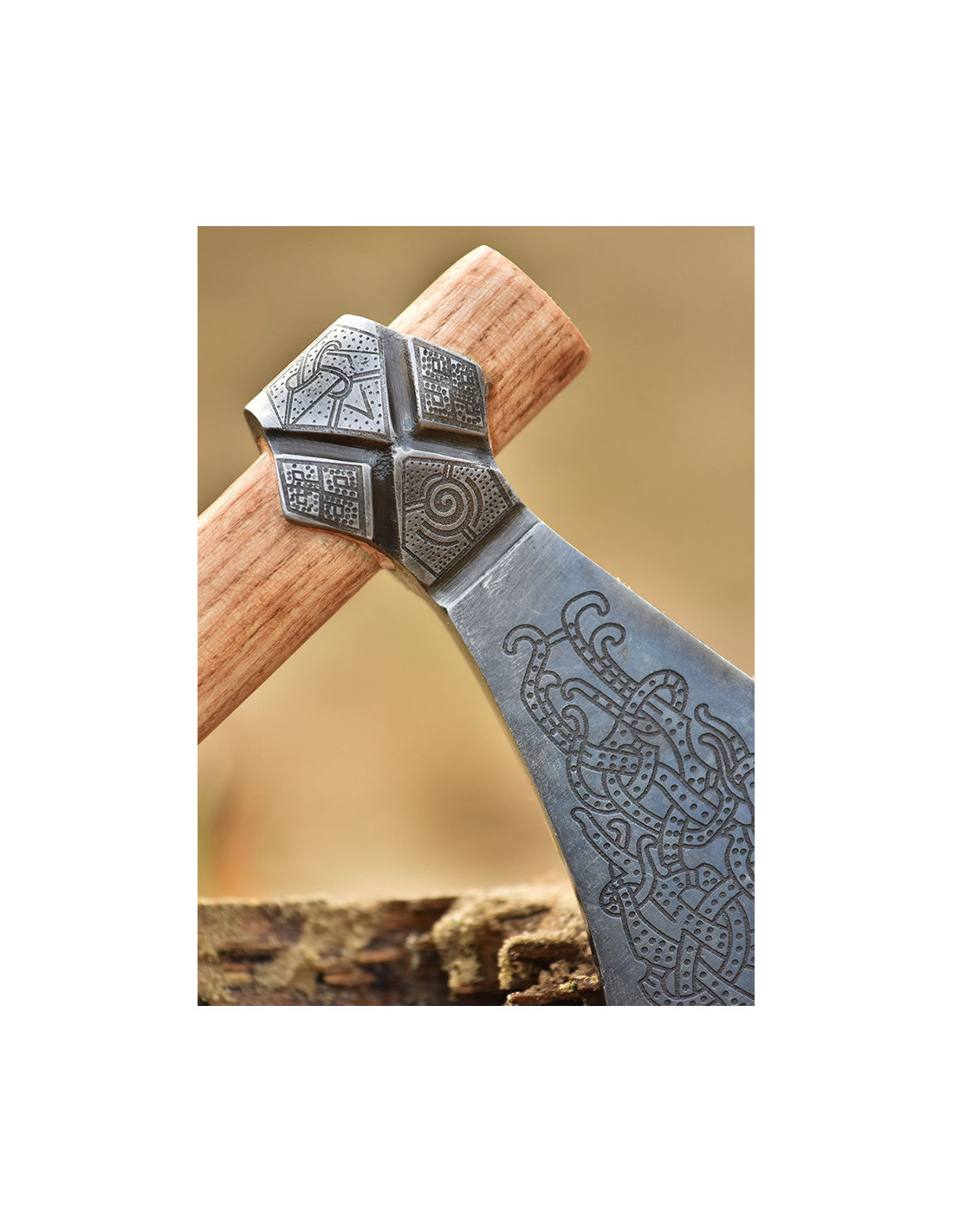 Queda por determinar si los motivos que adornan la cabeza del hacha en ambos lados son de influencia cristiana o pagana. Un lado tiene un patrón intrincado de zarcillos, que puede ser una representación del árbol de la vida cristiano o del fresno mundial Yggdrasil de la mitología nórdica. El otro lado presenta una criatura parecida a un pájaro entrelazada que se supone que representa un fénix (como símbolo de la resurrección de Cristo) o Gullinkambi, el gallo posado sobre Yggdrasil que despierta al Einherjer en Valhalla todos los días y cantará a los dioses y guerreros para anunciar el comienzo de Ragnarök.