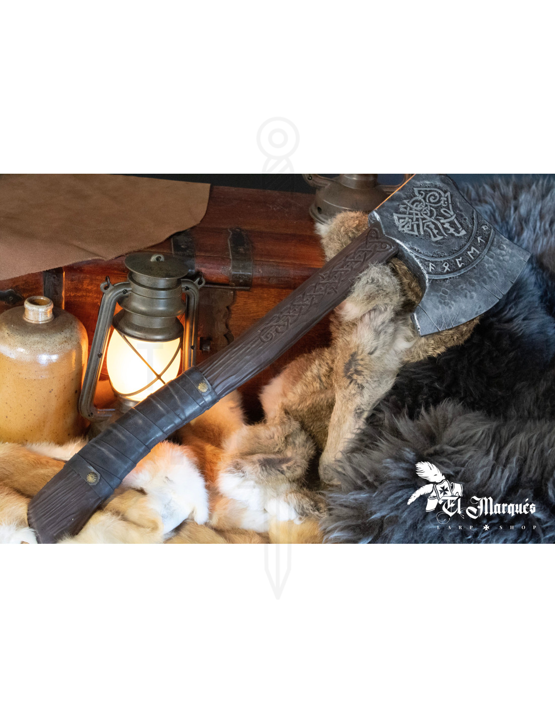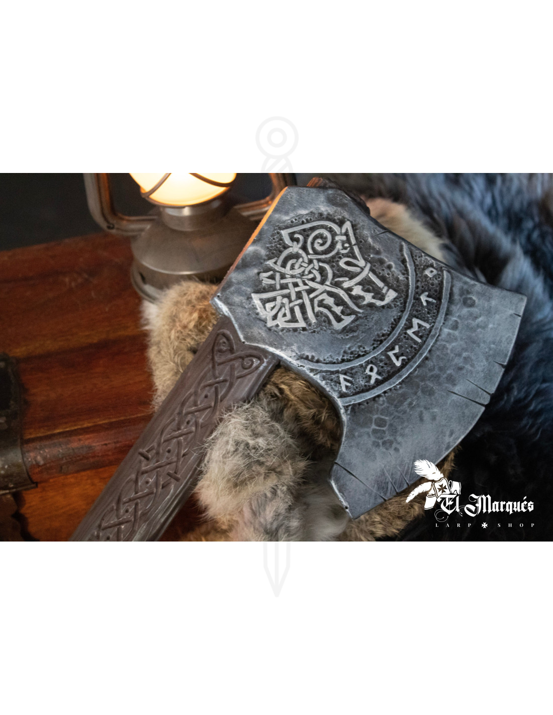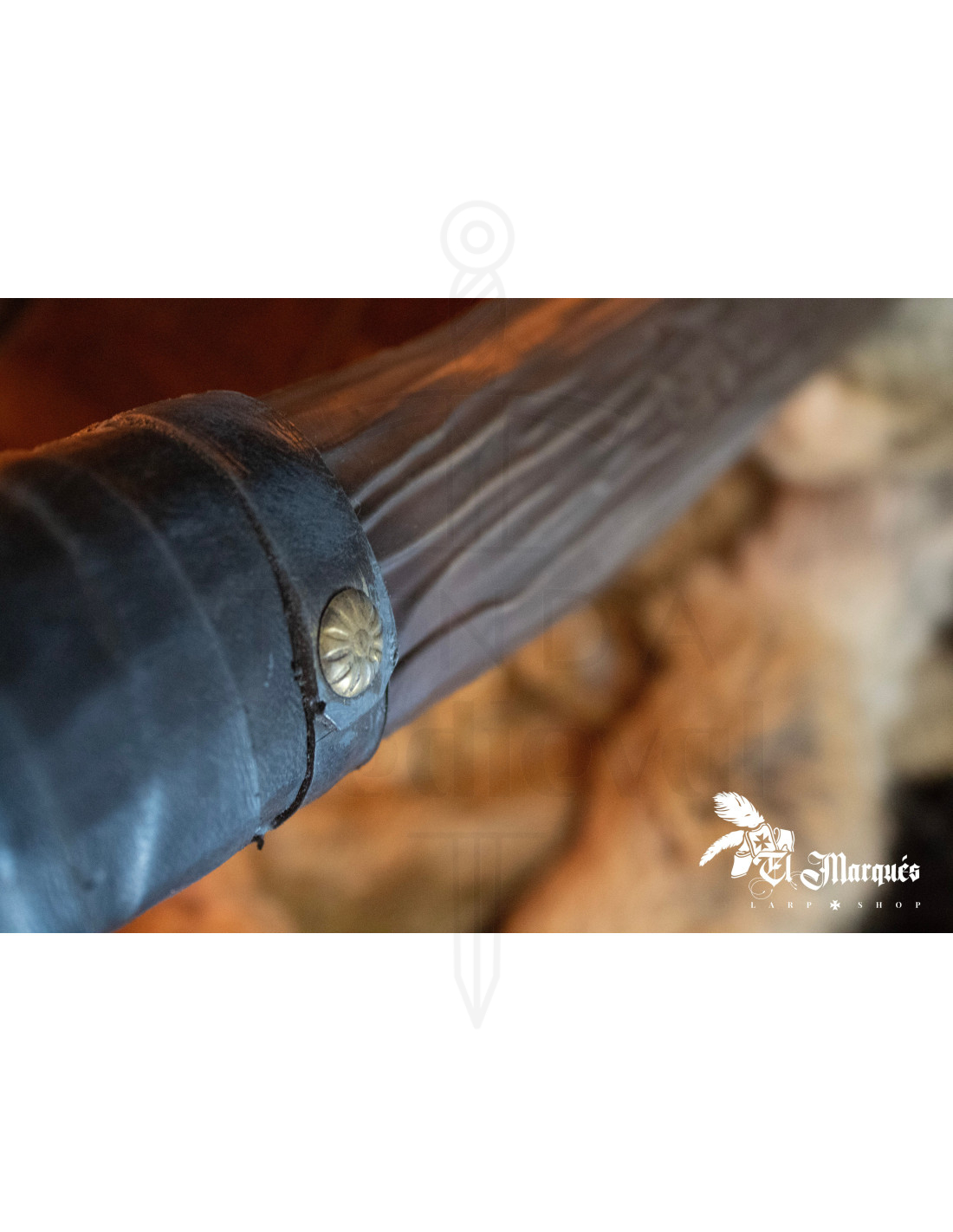 La cabeza del arma muestra efectos de forja, cortes trabajados y una decoración con runas nórdicas y un lobo entre nudos vikingos, detalles que potencian la narrativa personal de tu personaje y llaman la atención en ferias, eventos LARP y sesiones fotográficas. Es una elección pensada para quienes buscan impacto visual y coherencia temática en cada escena.