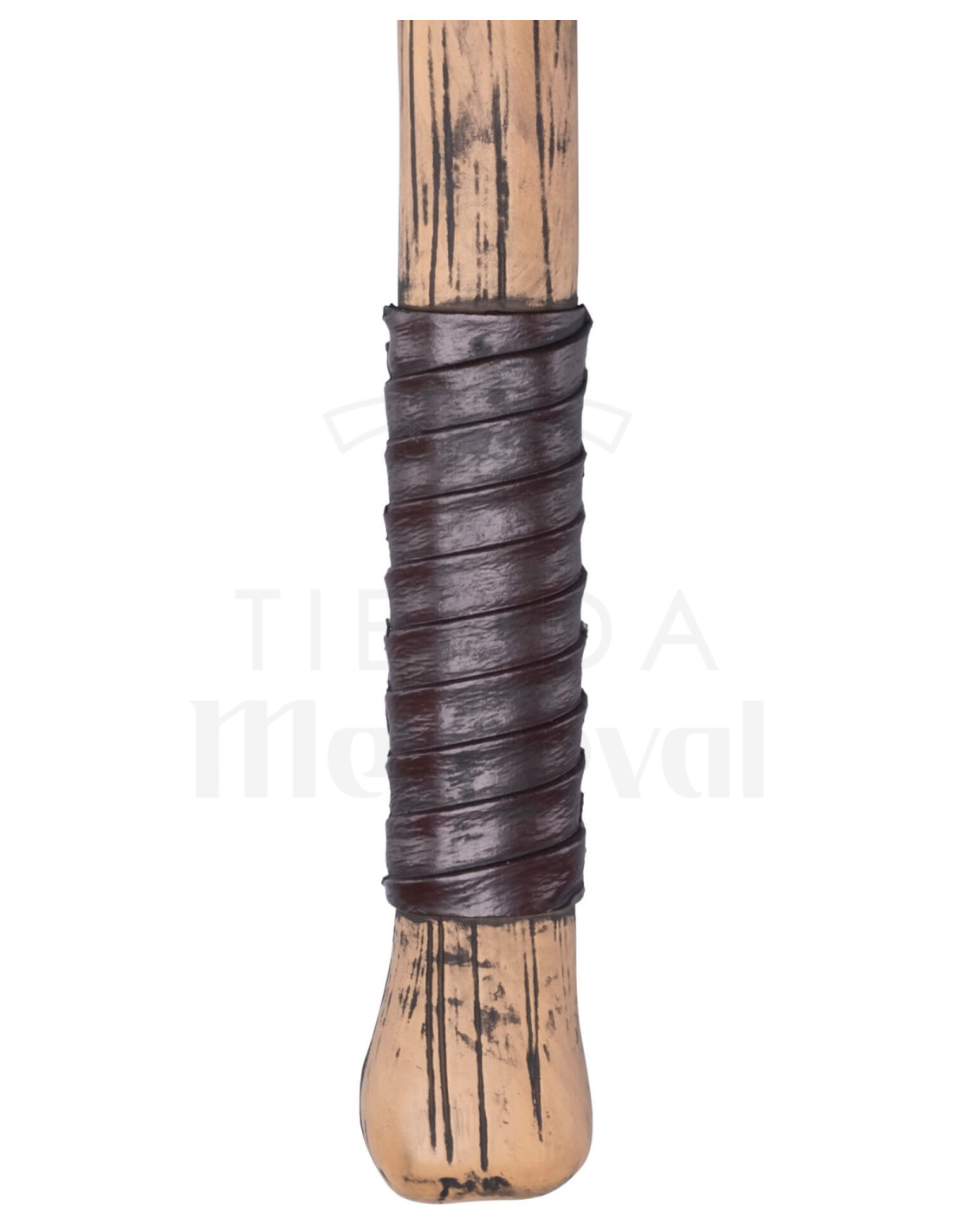 El ensamblaje que simula una pieza metálica con tres remaches añade verosimilitud al conjunto, transmitiendo robustez y coherencia con armaduras y atuendos de época. El mango de tono madera clara, con vetas oscuras, recrea el tacto y la vista de un hacha trabajada, mientras que la envoltura en la parte inferior ofrece un agarre firme y cómodo para mantener el control en cada golpe.