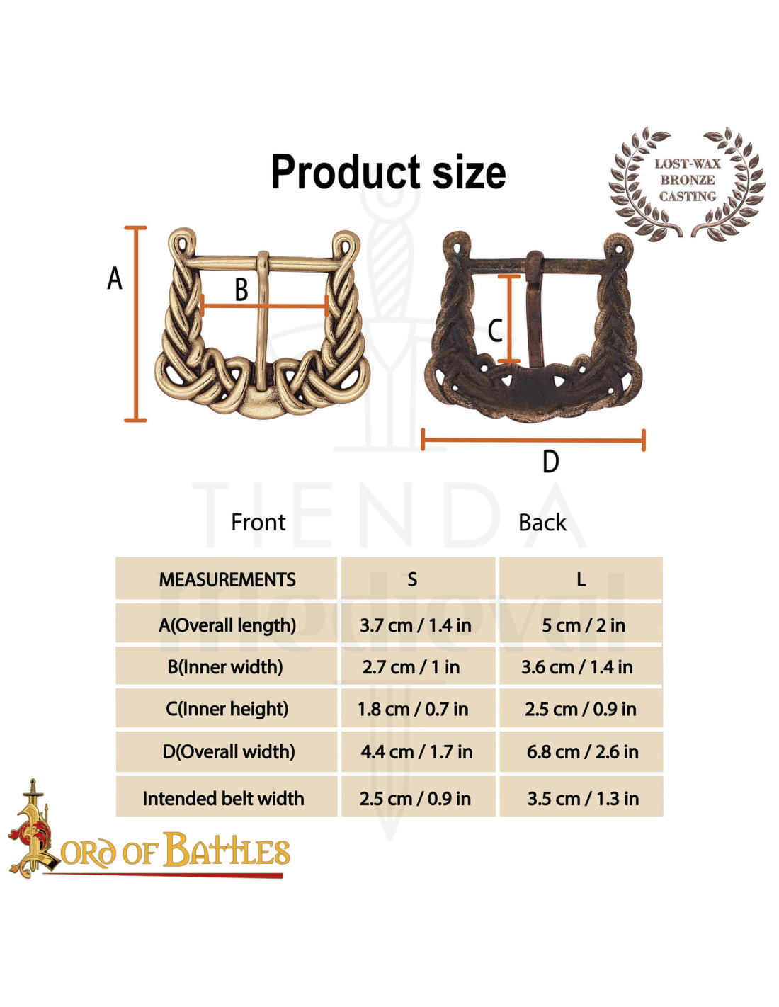 Forjada con la técnica tradicional de cera perdida, esta hebilla en bronce envejecido reproduce con fidelidad el gesto de los orfebres vikingos, ofreciendo una presencia cálida y una pátina que gana carácter con el uso. El acabado color latón aporta ese aspecto crudo y trabajado que encaja tanto en atuendos históricos como en accesorios de estilo rústico.