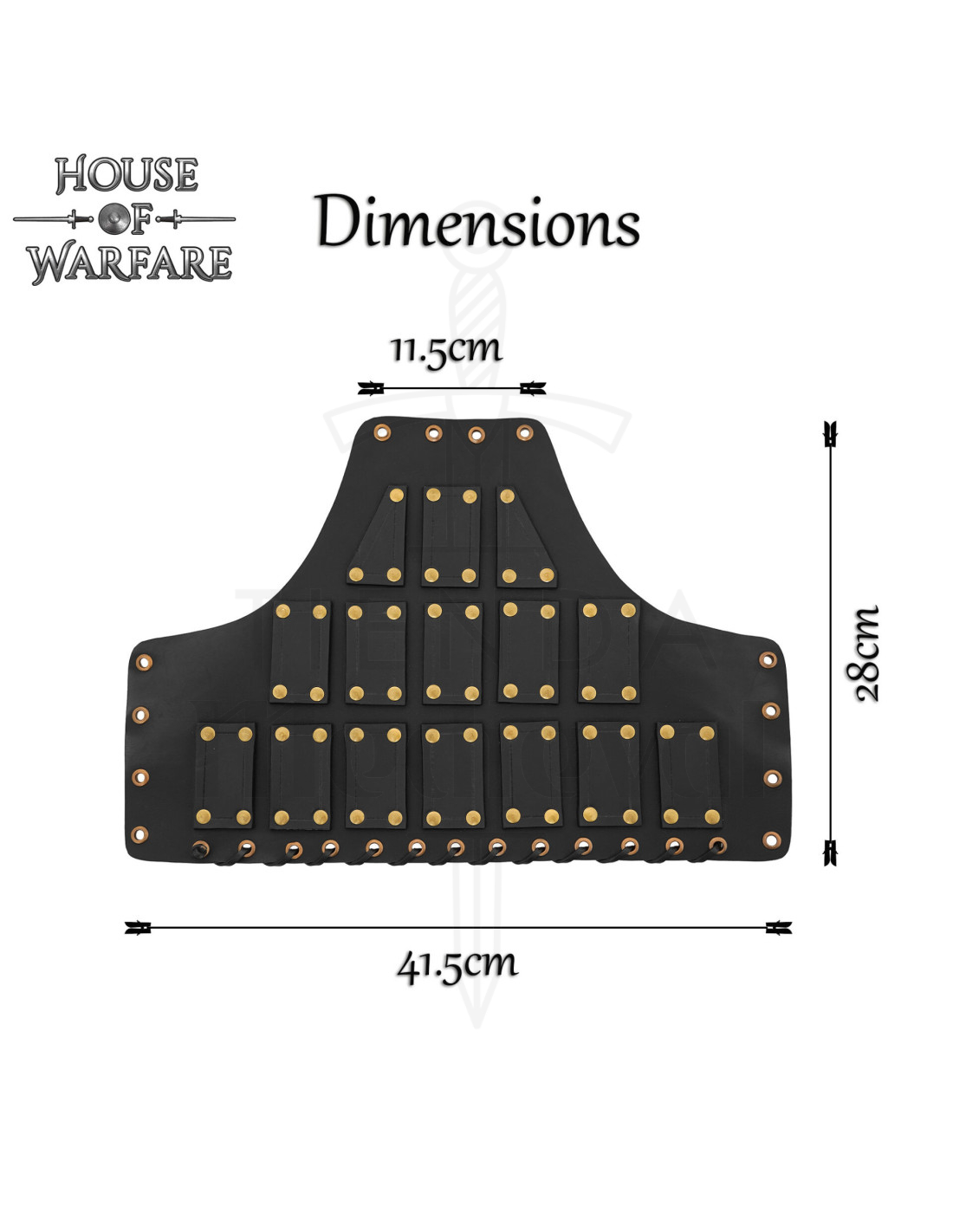 Las múltiples placas rectangulares superpuestas, fijadas con remaches de latón, distribuyen los impactos y refuerzan la superficie, mientras que el acabado en negro realza cualquier atuendo oscuro y añade un aire de gravitas histórico. Los remaches dorados no solo aseguran su resistencia, sino que también crean un contraste visual que eleva el conjunto sin recargarlo.