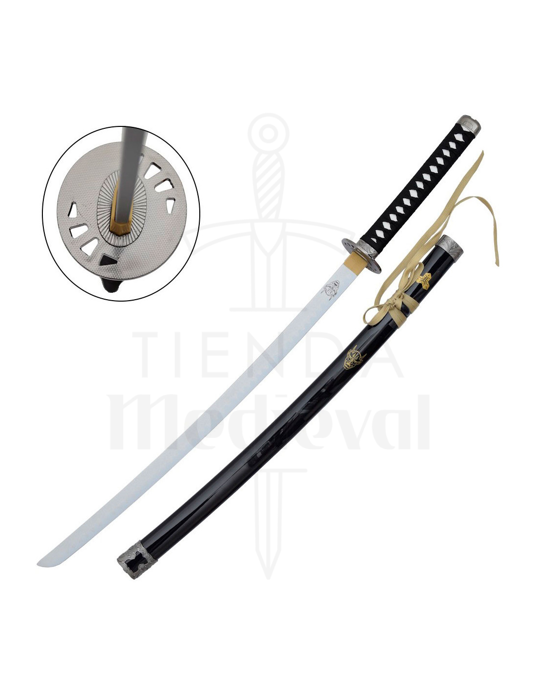Su funda negra brillante, complementada con un lazo claro decorativo, hace que sea fácil de exhibir en tu colección o usar como pieza temática para eventos o cosplay. La hoja de 680mm, acompañada de un peso ligero y equilibrado, permite una apariencia realista sin preocuparte por la maniobrabilidad. Además, su longitud total de 990mm y el escudamento en bambú brindan un aspecto auténtico y elegante.