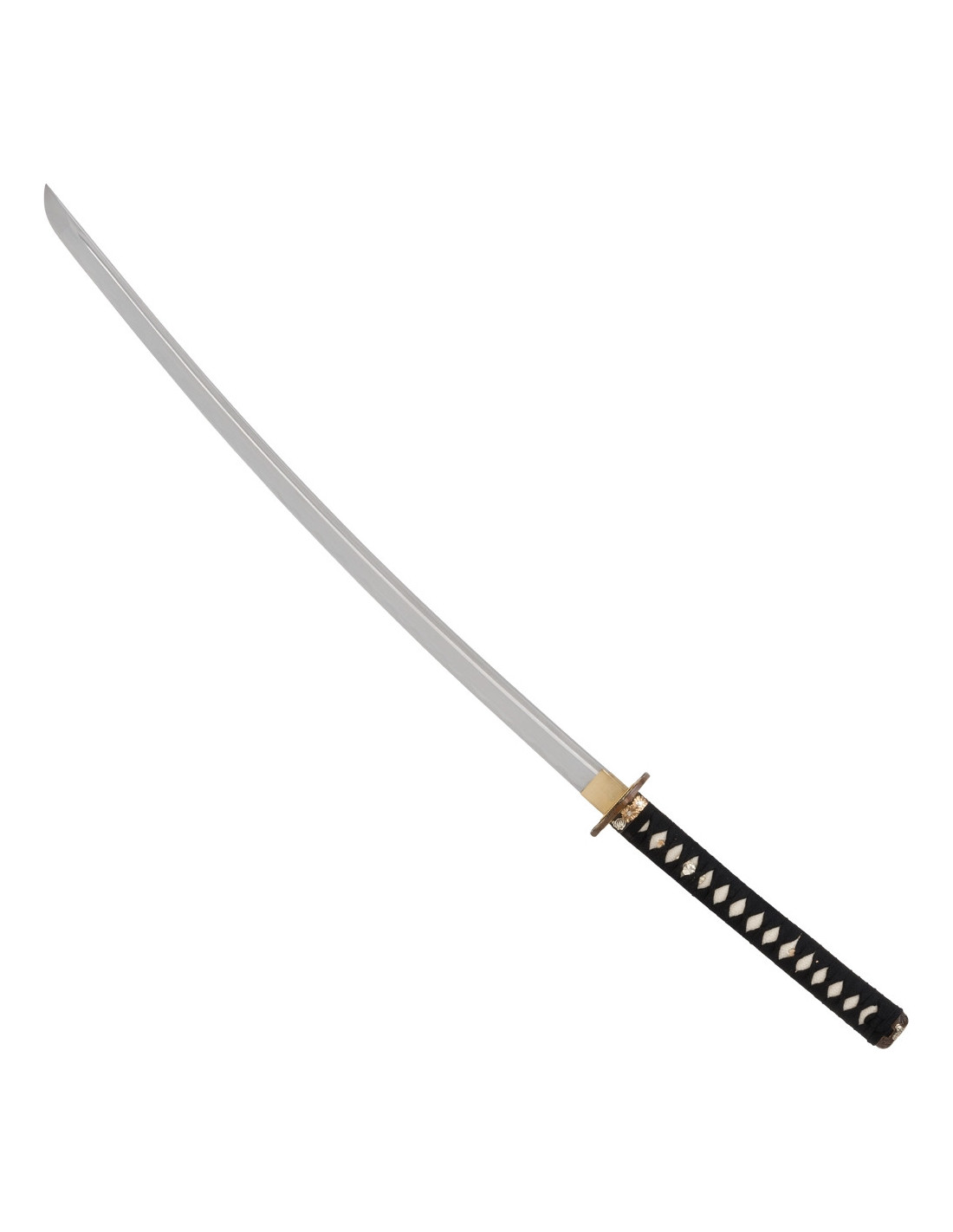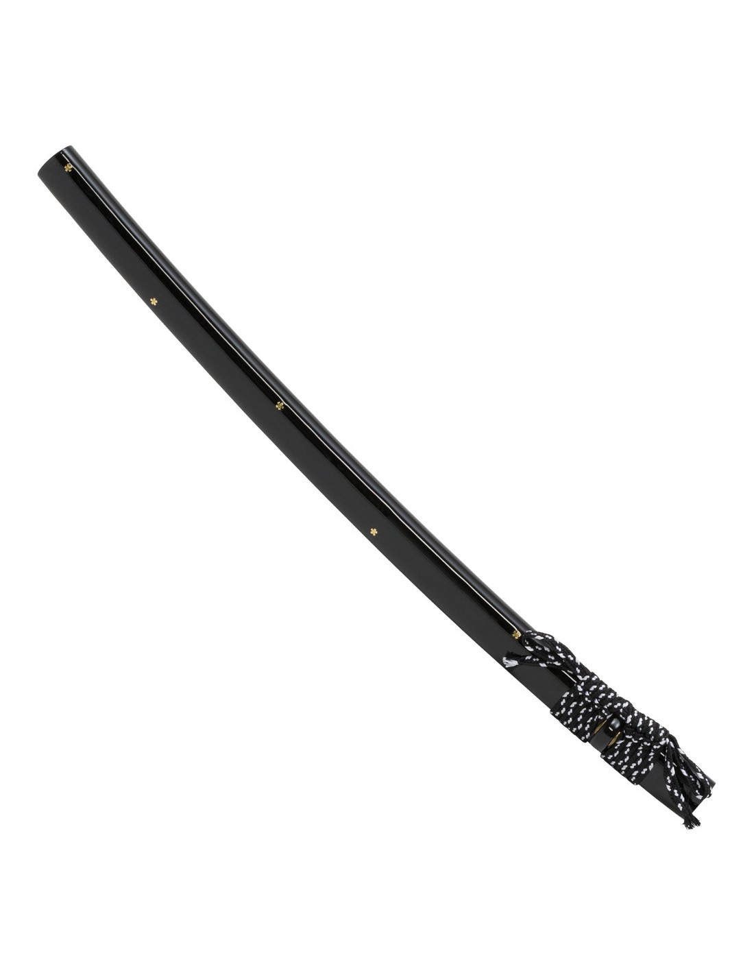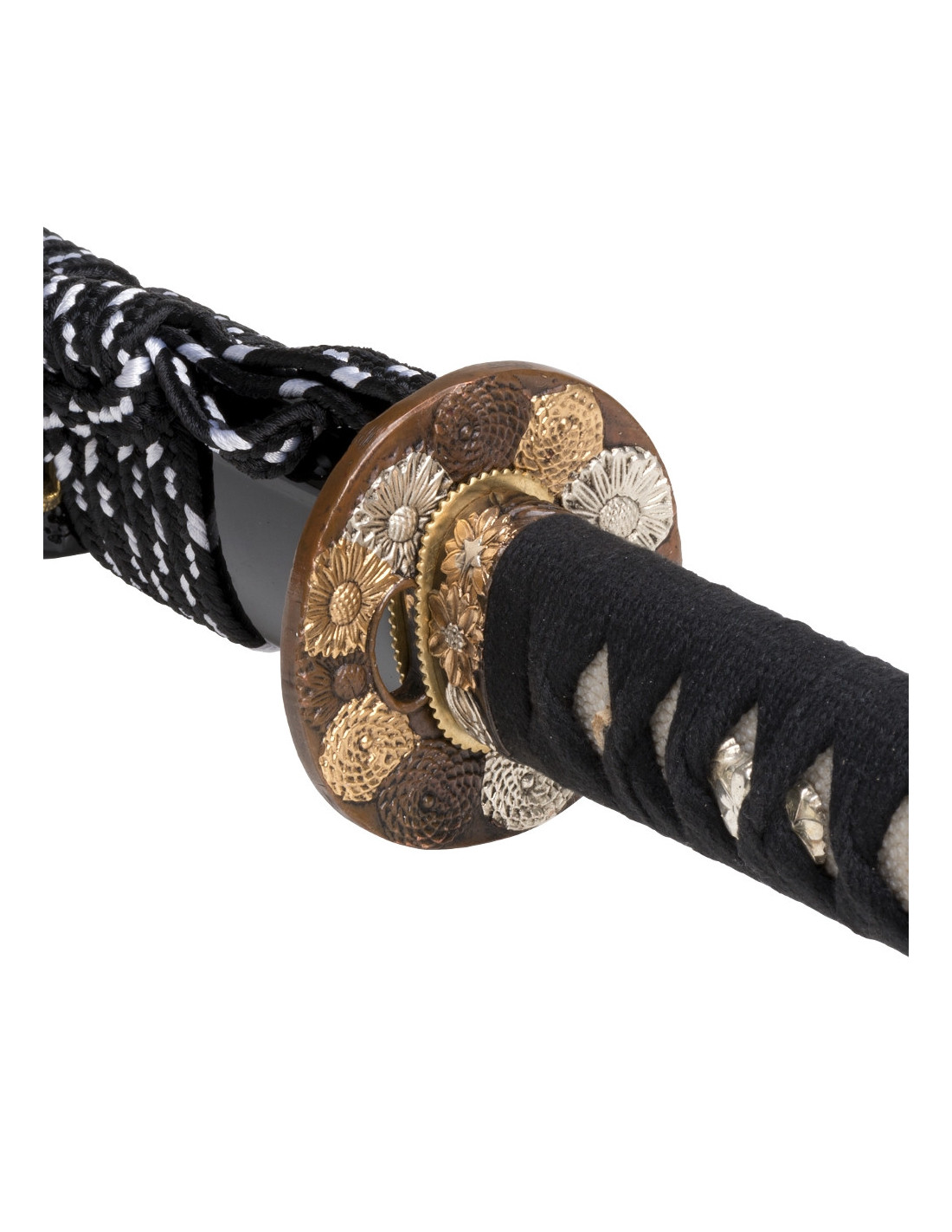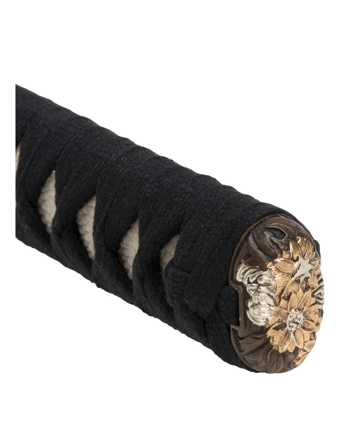 El mango de la katana presenta una envoltura en algodón negro con estilo clásico Hineri-Maki, proporcionando un agarre firme y cómodo durante su uso. Además, la vaina lacada en negro con acabado espejo, fabricada en madera estilo Kuroro, le da un toque de sofisticación y protección a la espada.