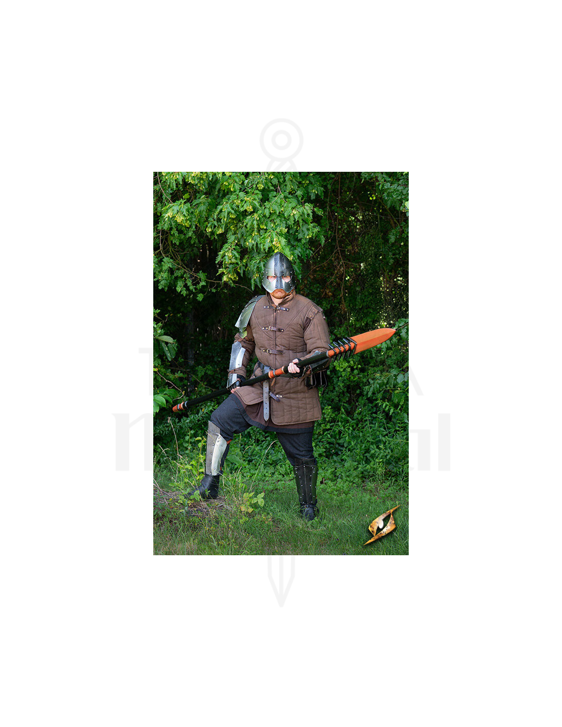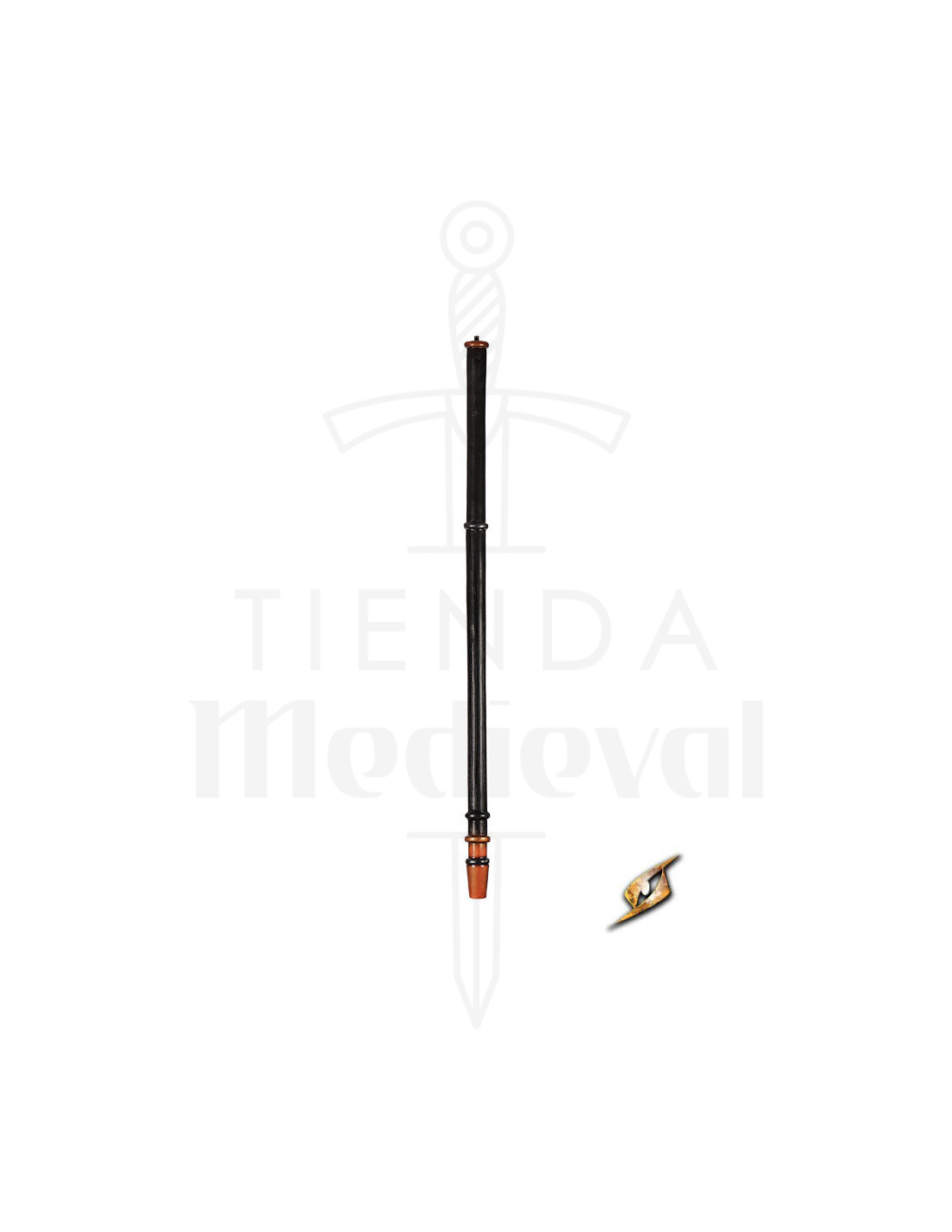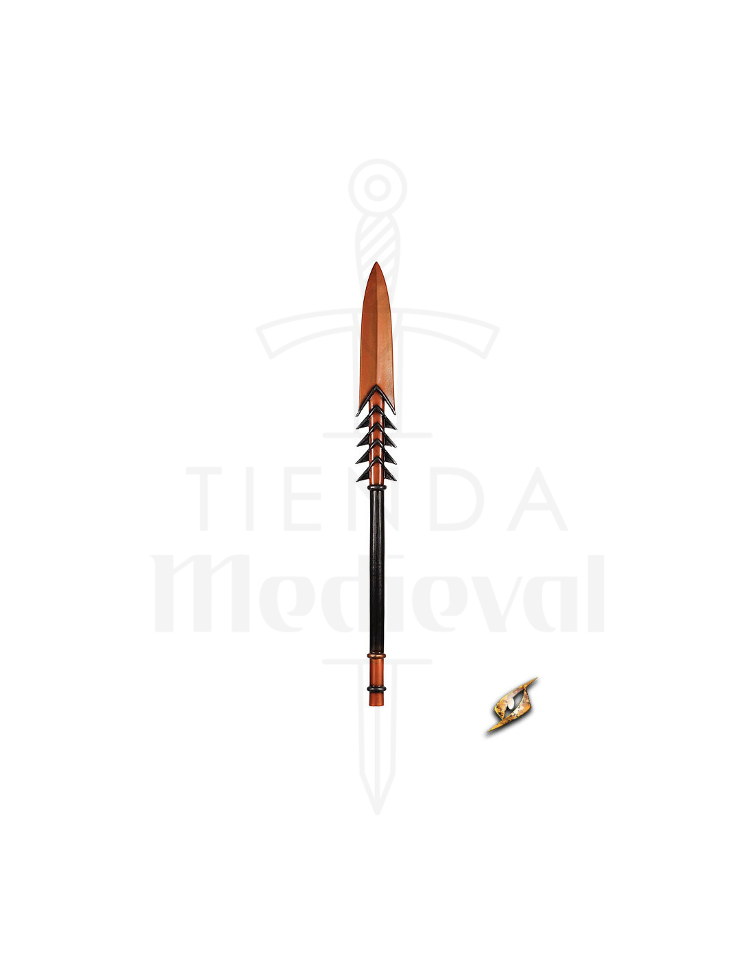 Su hoja dentada y su acabado en un vibrante tono de bronce anaranjado llaman la atención a simple vista, aportando un aire de antigüedad y poderío a tu personaje. La empuñadura, cuidadosamente pintada para simular metal envejecido y envoltorios de cuero, combina resistencia y estética, permitiendo un agarre firme en cada golpe. La lanza, con un cuerpo que imita con realismo la textura de madera robusta, es ligera y fácil de manejar, ideal para movimientos ágiles y combates dinámicos.