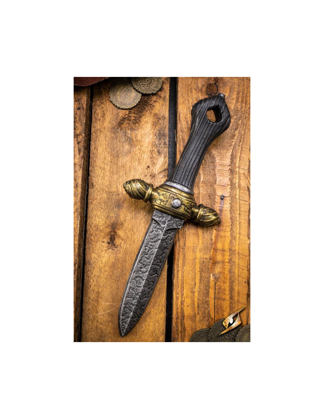 Este cuchillo lanzador cuenta con una hoja puntiaguda y de doble filo de 11 cm con un acabado metálico, lo que le brinda un aspecto elegante y realista. Además, su cruceta acabada en color oro y su mango de madera de 5 cm agregan un toque de nobleza a tu arsenal de armas.