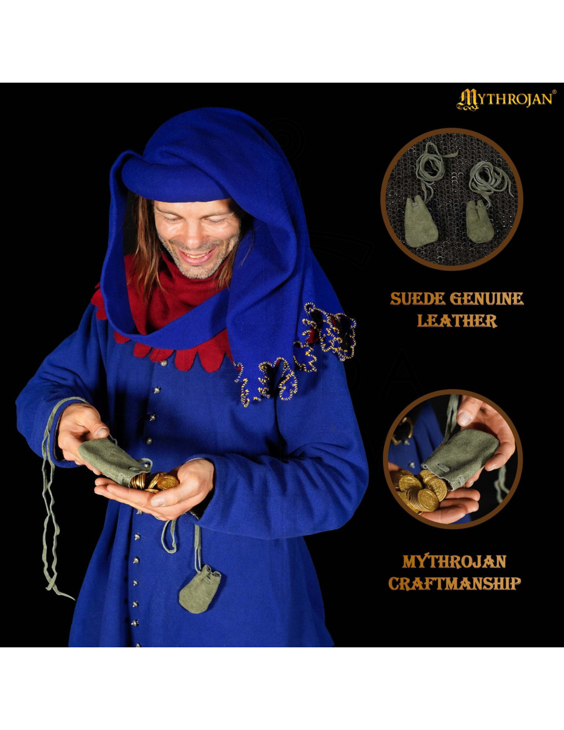 Trae a tu mundo medieval un toque auténtico con estas elegantes bolsas limosneras de piel de ante en vibrante color verde. Perfectas para guardar monedas, dados, hierbas o pequeñas pertenencias, su acabado suave y su diseño clásico las hacen ideales para completar cualquier atuendo de LARP, SCA, ferias renacentistas o temas vikings.
