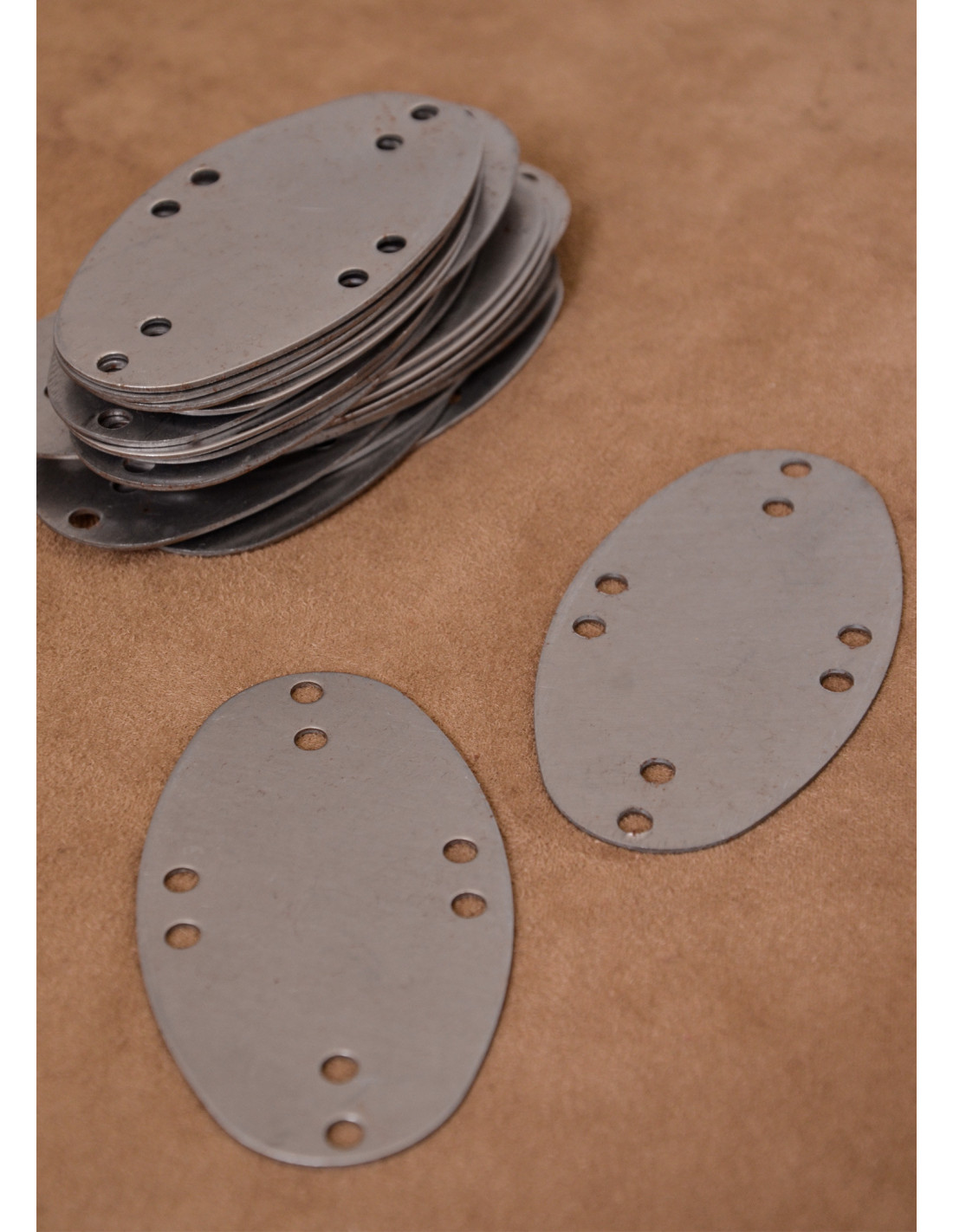 Nuestro set de cachas de acero está diseñado para que puedas ensamblar tu propia armadura de láminas o armadura de escamas de manera sencilla y rápida. Cada una de las 25 placas de acero cuenta con ocho agujeros estratégicamente ubicados para asegurar la máxima protección sin comprometer la movilidad.