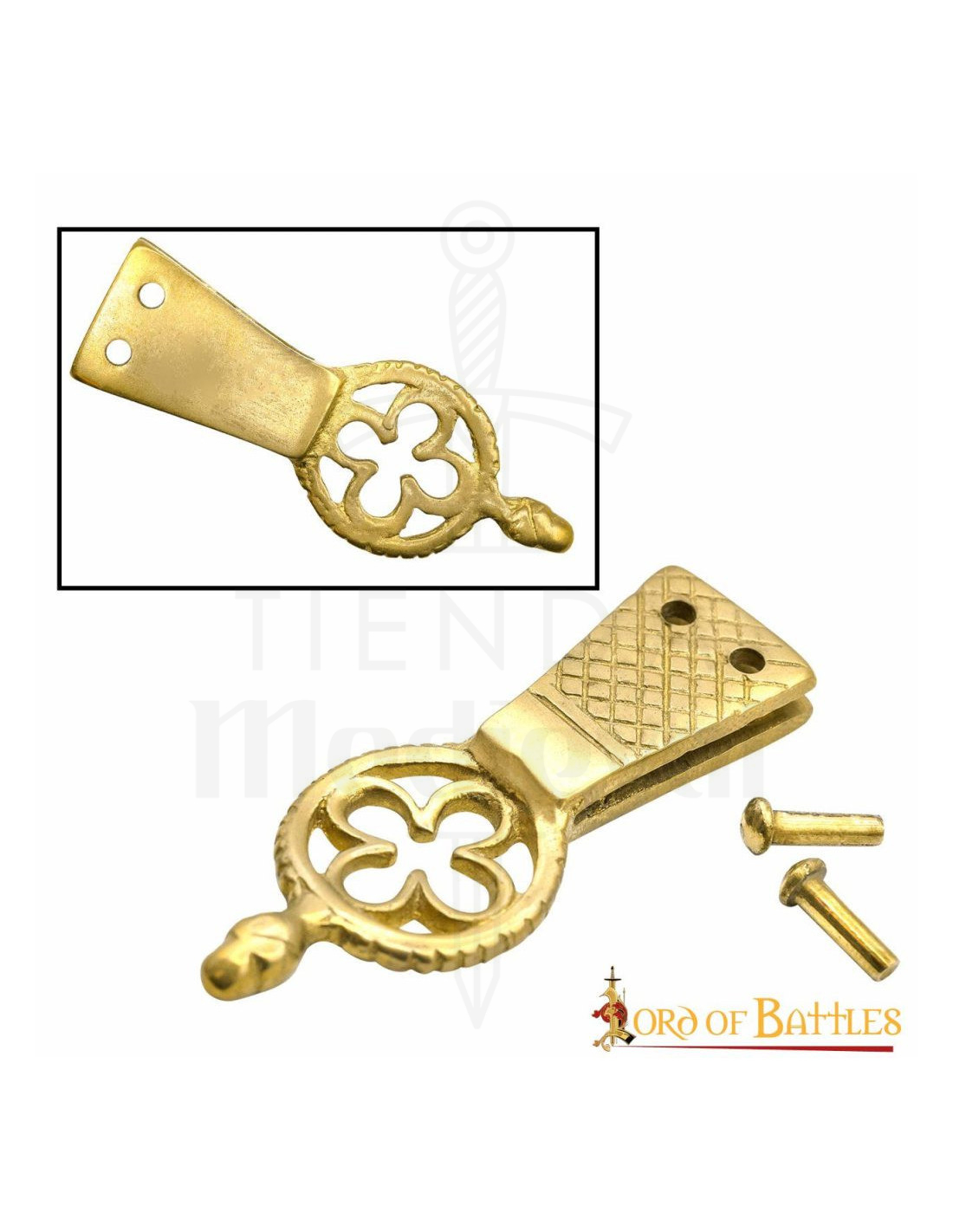 Fabricadas en latón de alta calidad, estas puntas son resistentes y tienen un acabado que brilla con un hermoso tono dorado, resaltando cualquier textura de cuero o material en el que las coloques. La superficie muestra un patrón ornamental que incluye un diseño de trébol, símbolo universal de buena suerte y protección, con una textura cuadrada en la parte superior que añade un toque decorativo y funcional. Gracias a su tamaño perfectamente proporcionado, se ajustan con facilidad y aseguran una presencia destacada sin perder comodidad.
