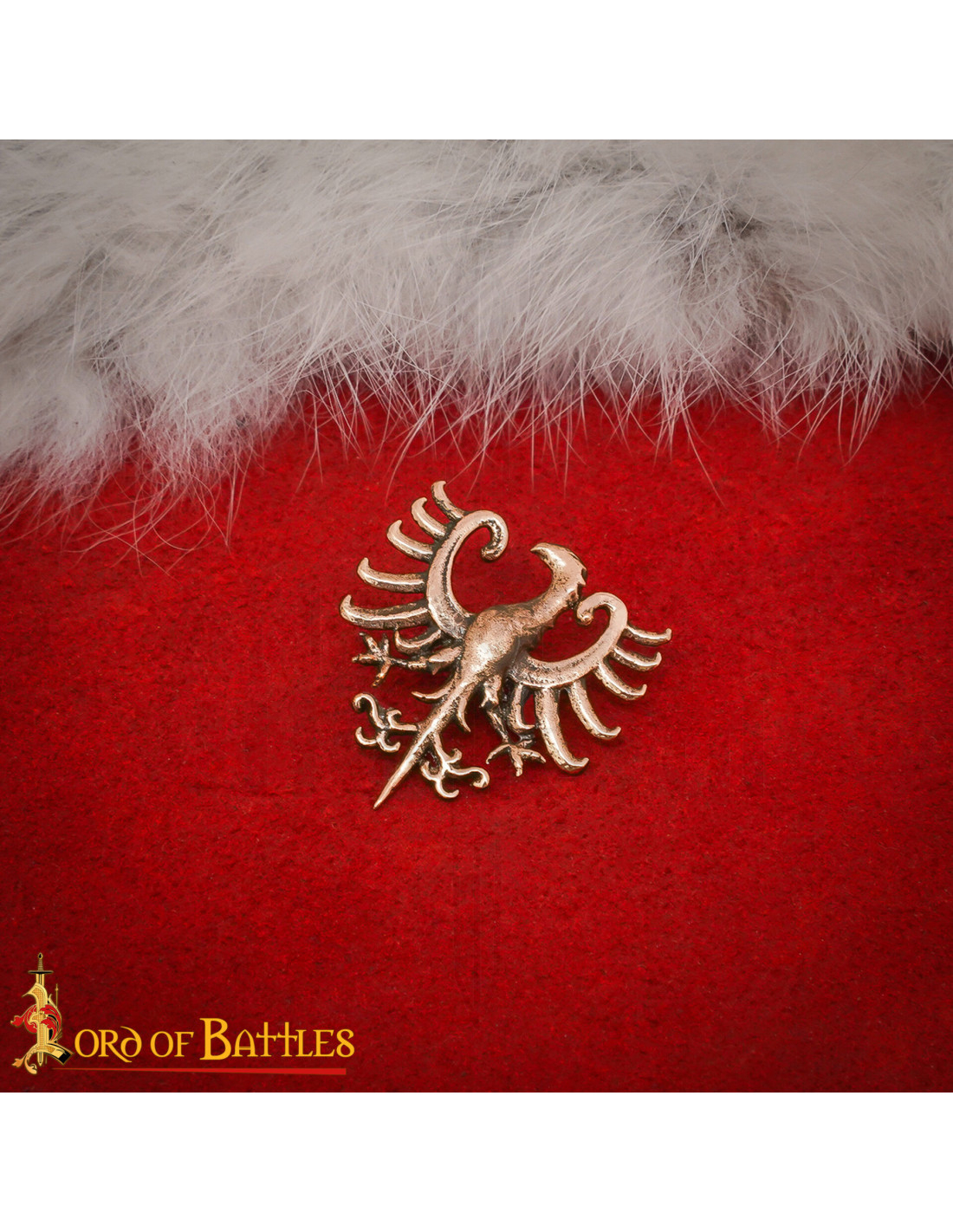 La pieza presenta un águila de una sola cabeza, con las alas extendidas y plumas trabajadas con precisión, además de garras que añaden ese toque de autoridad noble. El acabado en bronce envejecido y la textura ligeramente martillada realzan su aspecto auténtico, como si hubiera emergido de un estandarte medieval.
