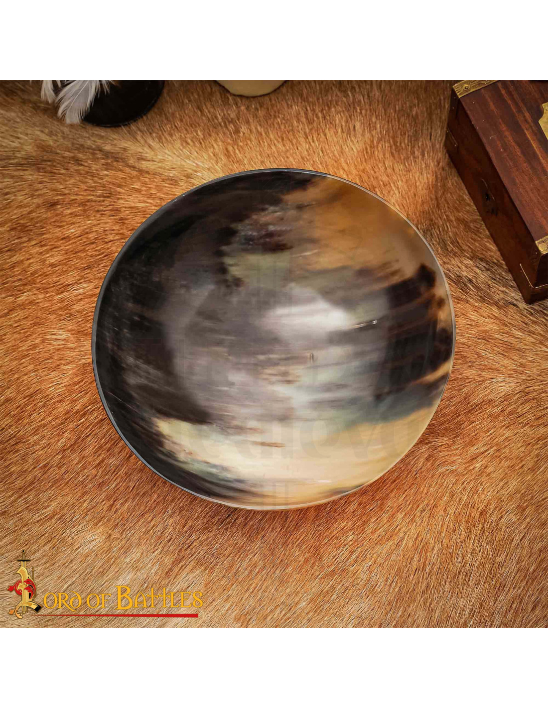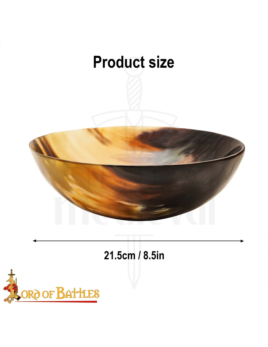 Este cuenco está hábilmente elaborado a mano por nuestros talentosos artesanos utilizando auténtico cuerno de buey, lo que garantiza su robustez y longevidad. Con un diámetro aproximado de 21,5 cm, este cuenco es perfecto para servir una variedad de alimentos con estilo y elegancia medieval.