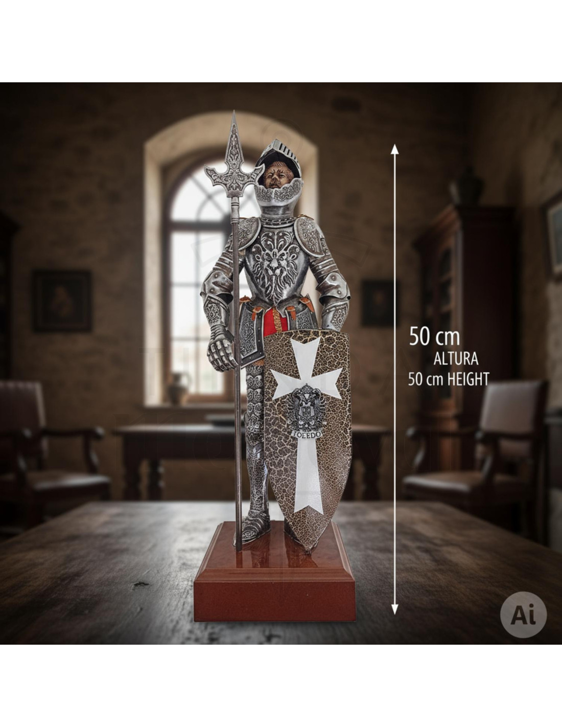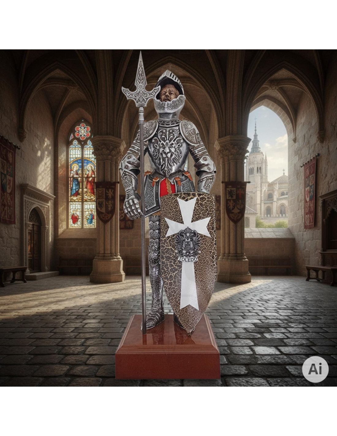 Esta increíble miniatura representa a un valiente caballero medieval equipado con una lanza y un escudo, listo para la batalla. Su tamaño de 50 cms. la convierte en una pieza llamativa y detallada que no pasará desapercibida en tu colección.