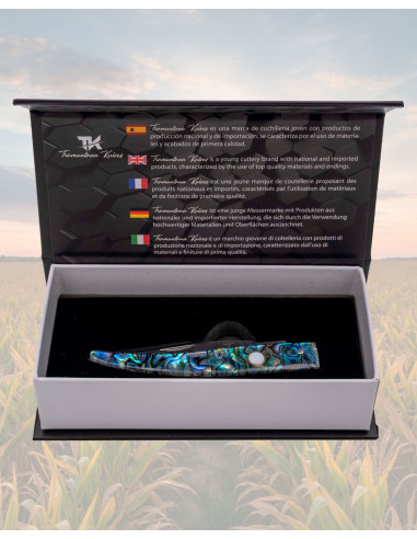 La navaja de campo Third modelo King of Surf es una herramienta excepcional que combina durabilidad, estilo audaz y funcionalidad en un diseño compacto. Con una longitud total de 17,6 cm y una hoja de 7,3 cm, esta navaja está pensada para quienes buscan una pieza que destaque por su rendimiento y su apariencia única.