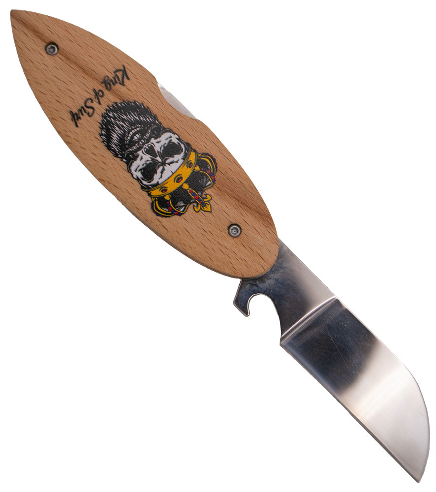 Además de su estética impactante, la navaja King of Surf incluye un abrelatas integrado, una herramienta práctica para abrir envases y latas en diversas situaciones. La navaja cuenta también con un sistema de bloqueo trasero, que garantiza que la hoja se mantenga fija durante su uso, proporcionando estabilidad y seguridad adicionales.